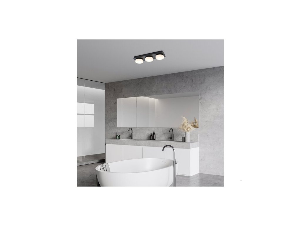 Jednoduchý design koupelnového stropního svítidla Attichus trojka je praktickou volbou téměř do každé moderní koupelny. Matná černá lampa vyrobená z kovu je doplněna kulatými, bílými plastovými stínítky a lze jej připevnit na strop pomocí velké čtvercového dekorativního podstavce. Díky čistému designu a černobílé barevné kombinaci se tento model skvěle hodí do mnoha interiérů. Attichus má zabudované LED světelné zdroje energetické třídy F, s celkovým výkonem 18 W, svítivostí 1700 lumenů se stínítkem, 2350 lumenů bez stínítka a životností 30 000 hodin. Světelné zdroje s barevnou teplotou 4000 K svítí přirozeným bílým světlem, které v koupelně vytváří moderní, čistý efekt. Krytí svítidla IP44 zajišťuje ochranu proti pronikání pevných částic o průměru větším než 1 mm, jakož i proti stříkající vodě z jakéhokoli směru. Šířka třídílného stropního svítidla je 430 mm a vzdálenost od stropu 70 mm.