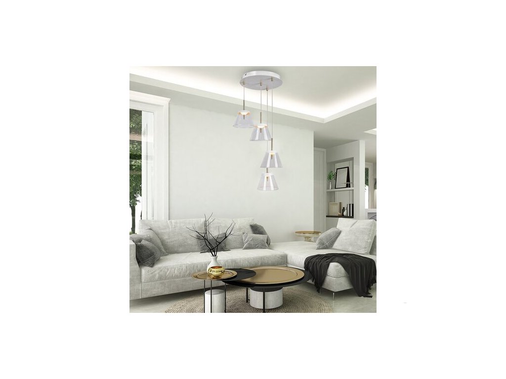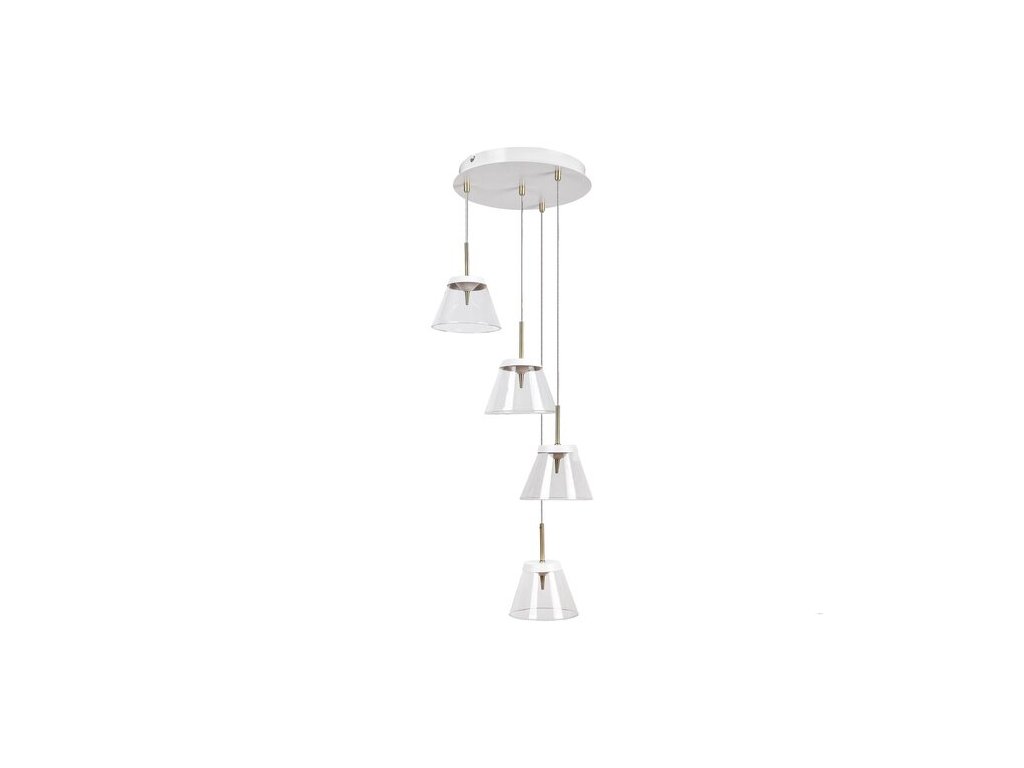 Čtyřnásobné závěsné svítidlo Aviana vyrobeno z kombinace kovu a skla, se doporučuje všem, kteří do svých moderních domů dávají přednost speciálnímu nápadnému příslušenství. Nádherné svítidlo Aviana zaručeně přiláká pozornost všech. Doporučujeme především do vašeho obývacího pokoje nebo jídelny. Kovové svítidlo bílé a bronzové barvy je doplněno průhlednými stínítky a velkým, kulatým, bílým dekorativním podstavcem. Čtyři hlavy svítidla, které visí v různých výškách, dělají tento model skutečně velkolepým. Svítidlo Aviana vyzařuje přirozené bílé světlo, které vytváří elegantní moderní efekt. Závěsné svítidlo má vestavěné LED světelné zdroje. Mají celkový výkon 24 W, svítivost 1920 lumenů a barevnou teplotu 4000 K. závěsné svítidlo Aviana má průměr 390 mm a jeho vzdálenost od stropu je 1490 mm. Na tento krásný a elegantní model se vztahuje 5letá záruka.