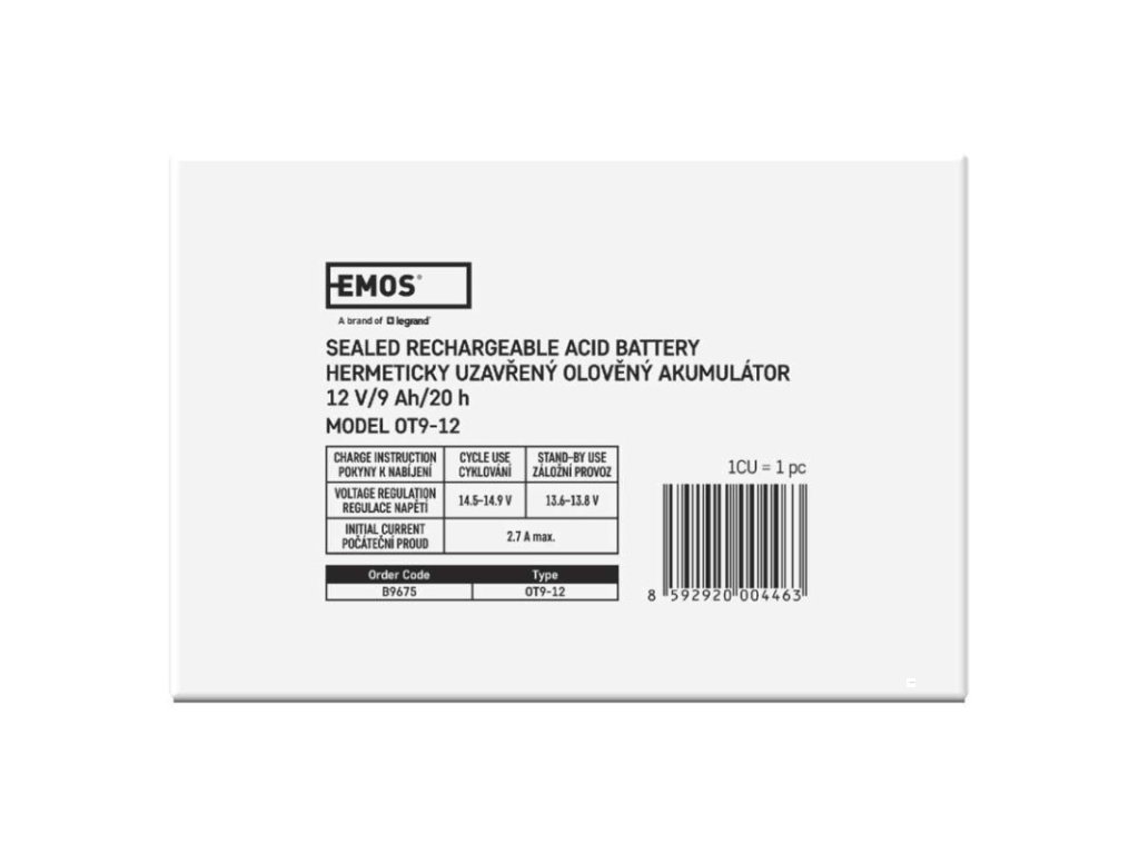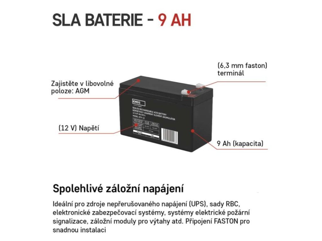 bezúdržbový: ano|chemické složení: Pb|EPS (elektronické požární systémy): ne|EZS (elektronické zabezpečovací systémy): ne|hmotnost: 2,42 kg|kapacita: 9 Ah|napětí: 12 V|nouzové osvětlení: ne|optimální životnost: 5 let|PARADOX: ne|prodejní obal: 1 ks|rozměr: 151 × 65 × 94 mm|technologie: AGM|terminál: faston 6,3 mm|UPS (záložní zdroje): ano|ÚSTŘEDNY JABLOTRON JA100K: ne|ÚSTŘEDNY JABLOTRON JA106K: ne|ÚSTŘEDNY JABLOTRON JA106K(R): ne|ÚSTŘEDNY JABLOTRON JA82K: ne|ÚSTŘEDNY JABLOTRON JA83: ne|záložní baterie pro výtahy - osvětlení, hovor: neDoplňkové parametry