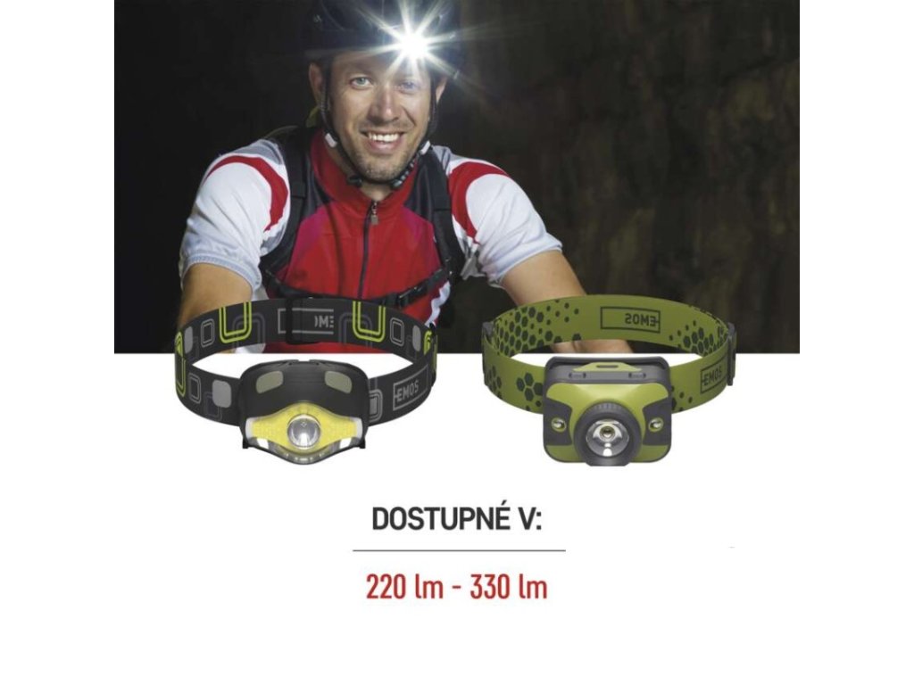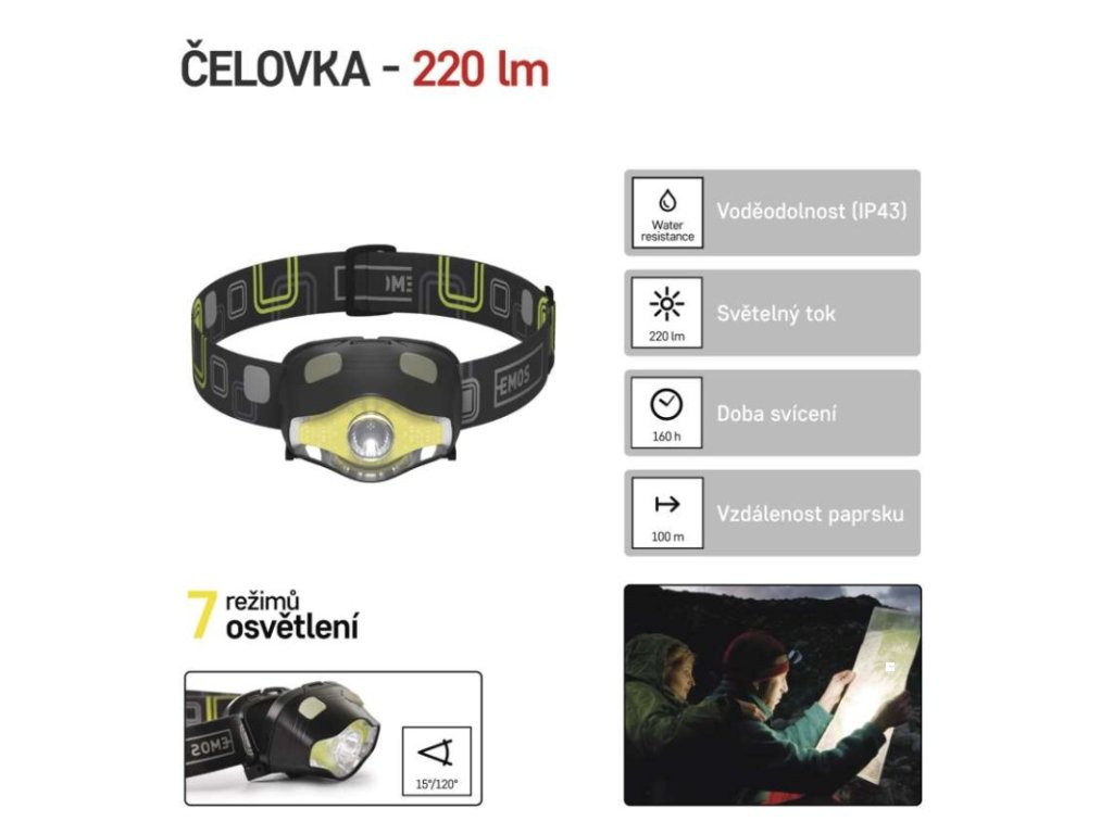 COB LED + LED čelovka P3536, 220 lm, 100 m, 3× AAA