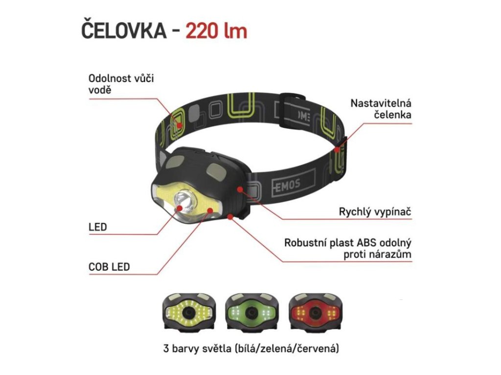 barva: černá|baterie součástí balení: ne|doba nabíjení: neuvádí se|doba svícení: 45–160 h|doba svícení detail: COB LED + LED 100 % – 45 h, LED 100 % – 70 h, LED 50 % – 160 h, COB LED 100 % – 65 h|dosvit: COB LED + LED 100 % – 100 m, LED 100 % – 100 m, LED 50 % – 50 m, COB LED 100 % – 20 m|fokus: ne|hmotnost: 65 g/100 g|LED indikace nabíjení: neuvádí se|LED indikace stavu akumulátoru: neuvádí se|materiál: ABS plast|maximální dosvit: 100 m|maximální světelný tok: 220 lm|nabíjecí: ne|napájení: 3× AAA|nárazuvzdornost: ano|počet režimů svícení: 7|příslušenství: neuvádí se|prodejní obal: 1 ks, papírový blistr|reflexní pásek: ano|režimy svícení: COB LED + LED 100 %, LED 100 %, LED 50 %, blikání, COB LED – bílá, COB LED – červená, COB LED – zelená|rozměr: 65 × 45 × 50 mm|speciální funkce: rychlé vypnutí|světelný tok: COB LED + LED 100 % – 220 lm, LED 100 % – 110 lm, LED 50 % – 25 lm, COB LED 100 % – 155 lm|typ baterie: LR03 (1,5 V)|typ napájecího konektoru: neuvádí se|úhel vyzařování: 15°/120°|voděodolnost: ano (IP43)|vybavení: luminescenční tlačítka|záruční doba: 2 roky|zdroj světla: LED + COB LED (zelená, červená)|značka: EMOSDoplňkové parametry