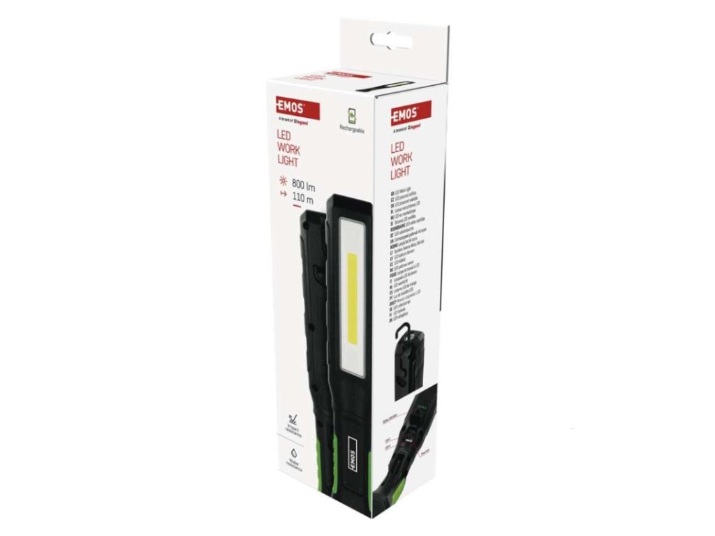 barva: zeleno-černá|baterie součástí balení: ano|doba nabíjení: 3 h|doba svícení: 2,5–7 h|doba svícení detail: COB LED 100 % – 2,5 h, COB LED 50 % – 5,5 h, SMD LED – 7 h|dosvit: COB LED 100 % – 35 m, COB LED 50 % – 20 m, SMD LED – 110 m|fokus: ne|hmotnost: 325 g|LED indikace nabíjení: ano|LED indikace stavu akumulátoru: ano|materiál: plast + pogumováno|maximální dosvit: 110 m|maximální světelný tok: 800 lm|nabíjecí: ano|napájení: Li-Ion|nárazuvzdornost: ano|počet režimů svícení: 3|příslušenství: USB kabel|prodejní obal: 1 ks, krabice|režimy svícení: COB LED 100 %, COB LED 50 %, SMD LED 100 %|rozměr: 50 × 50 × 255 mm|speciální funkce: funkce rychlého vypnutí, funkce ochrany baterie, funkce powerbank|světelný tok: COB LED 100 % – 800 lm, COB LED 50 % – 280 lm, SMD LED – 200 lm|typ baterie: 2 000 mAh/3,7 V|typ napájecího konektoru: USB-C|voděodolnost: ano (IP54)|vybavení: otočná rukojeť, 2× hák, 2× magnet|záruční doba: 2 roky|zdroj světla: COB LED + SMD LED|značka: EMOSDoplňkové parametry