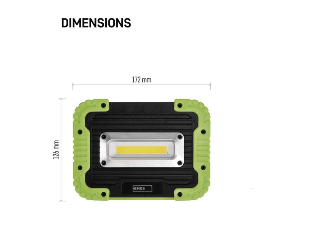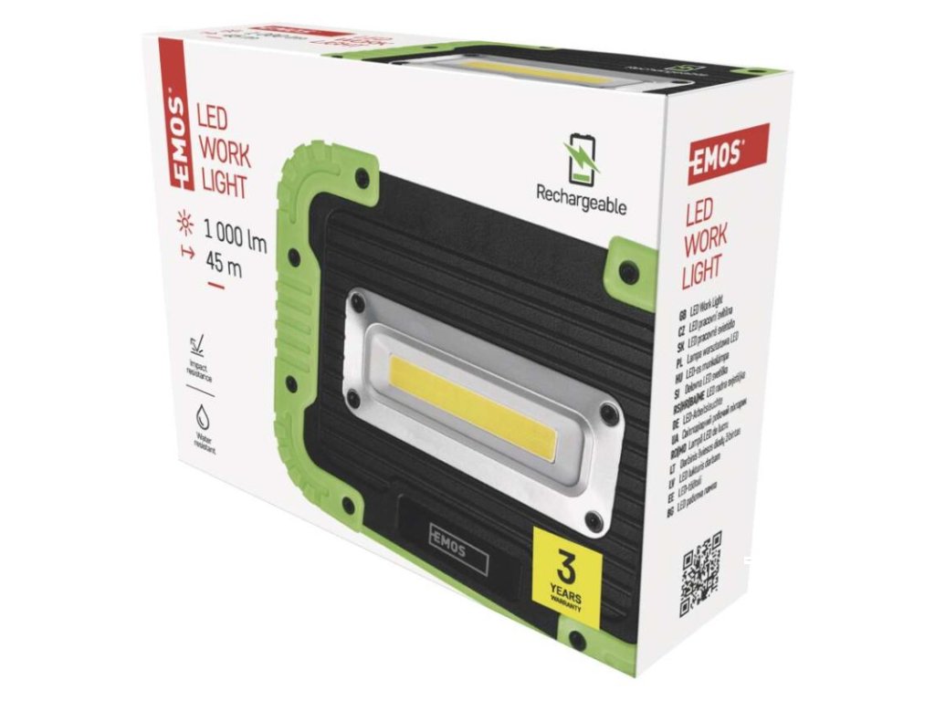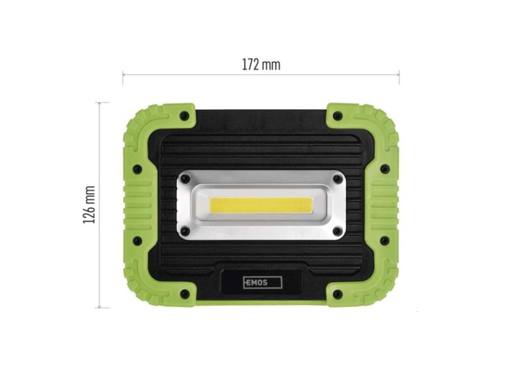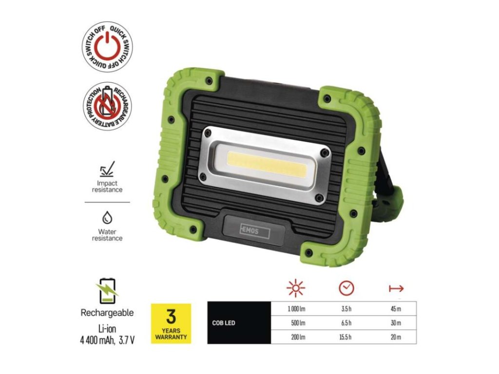 barva: černo-zelená|baterie součástí balení: ano|doba nabíjení: 7,5 h|doba svícení: 3,5–15,5 h|doba svícení detail: COB LED 100 % – 3,5 h, COB LED 50 % – 6,5 h, COB LED 20 % – 15,5 h|dosvit: COB LED 100 % – 45 m, COB LED 50 % – 30 m, COB LED 20 % – 20 m|fokus: neuvádí se|hmotnost: 453 g|LED indikace nabíjení: ano|LED indikace stavu akumulátoru: ano|materiál: ABS plast + guma|maximální dosvit: 45 m|maximální světelný tok: 1 000 lm|nabíjecí: ano|napájení: Li-Ion akupack|nárazuvzdornost: ano|počet režimů svícení: 3|příslušenství: USB kabel|prodejní obal: 1 ks, krabice|režimy svícení: COB LED 100 %, COB LED 50 %, COB LED 20 %|rozměr: 172 × 45 × 126 mm|speciální funkce: funkce rychlého vypnutí, funkce ochrany baterie|světelný tok: COB LED 100 % – 1 000 lm, COB LED 50 % – 500 lm, COB LED 20 % – 200 lm|typ baterie: 4 400 mAh/3,7 V|typ napájecího konektoru: micro USB B|voděodolnost: ano (IP44)|vybavení: otočná rukojeť|záruční doba: 3 roky|zdroj světla: COB LED|značka: EMOSDoplňkové parametry