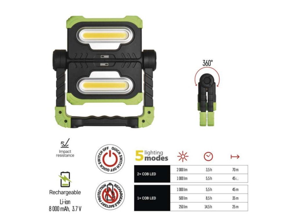 COB LED nabíjecí pracovní reflektor P4536, 2000 lm, 8000 mAh