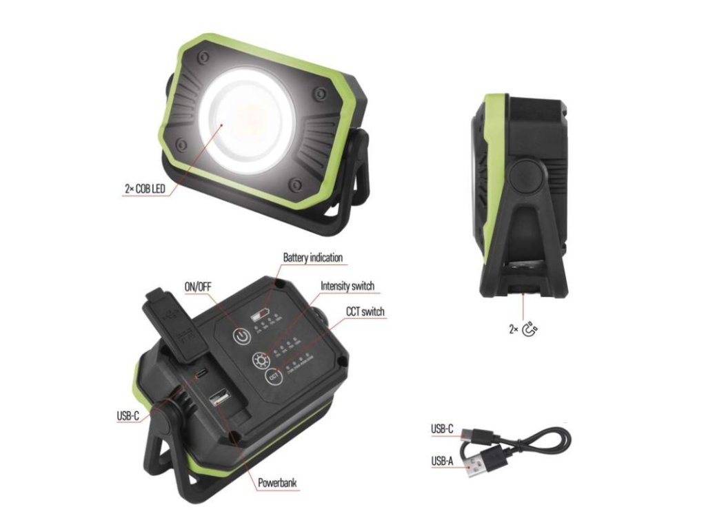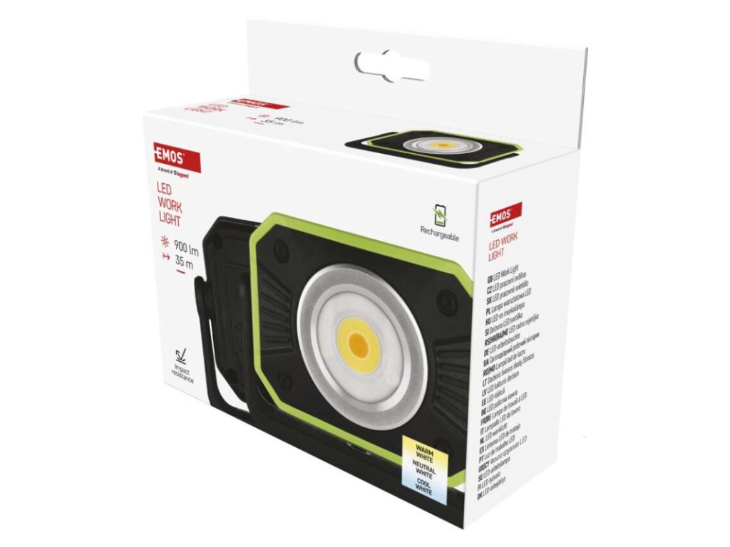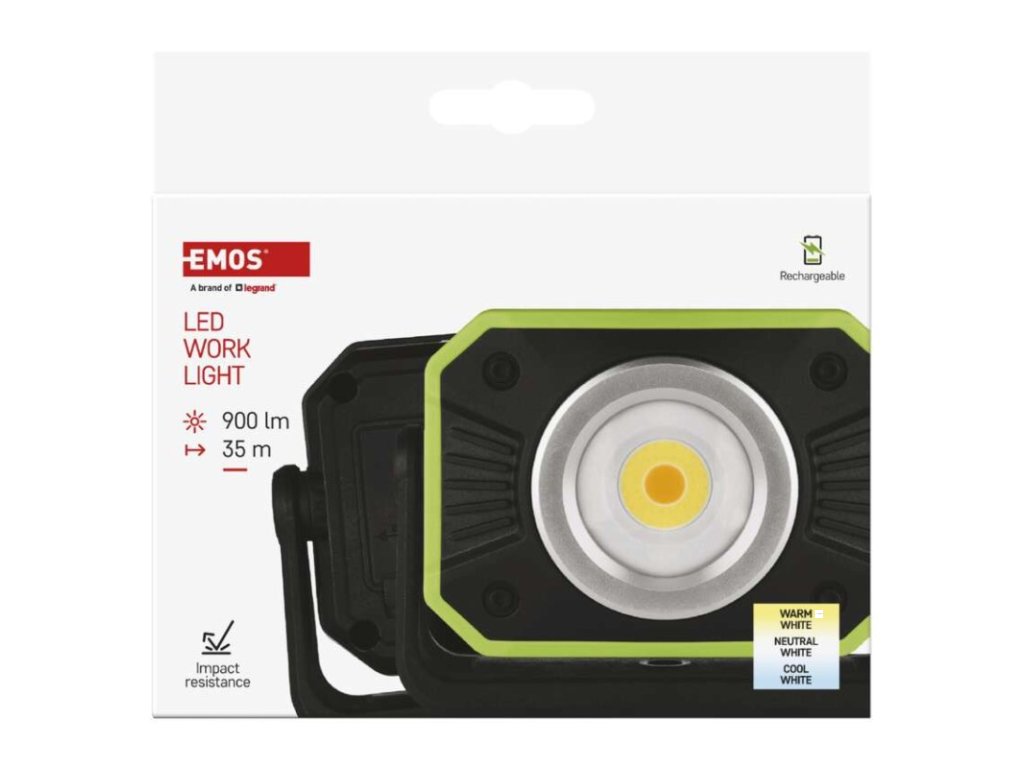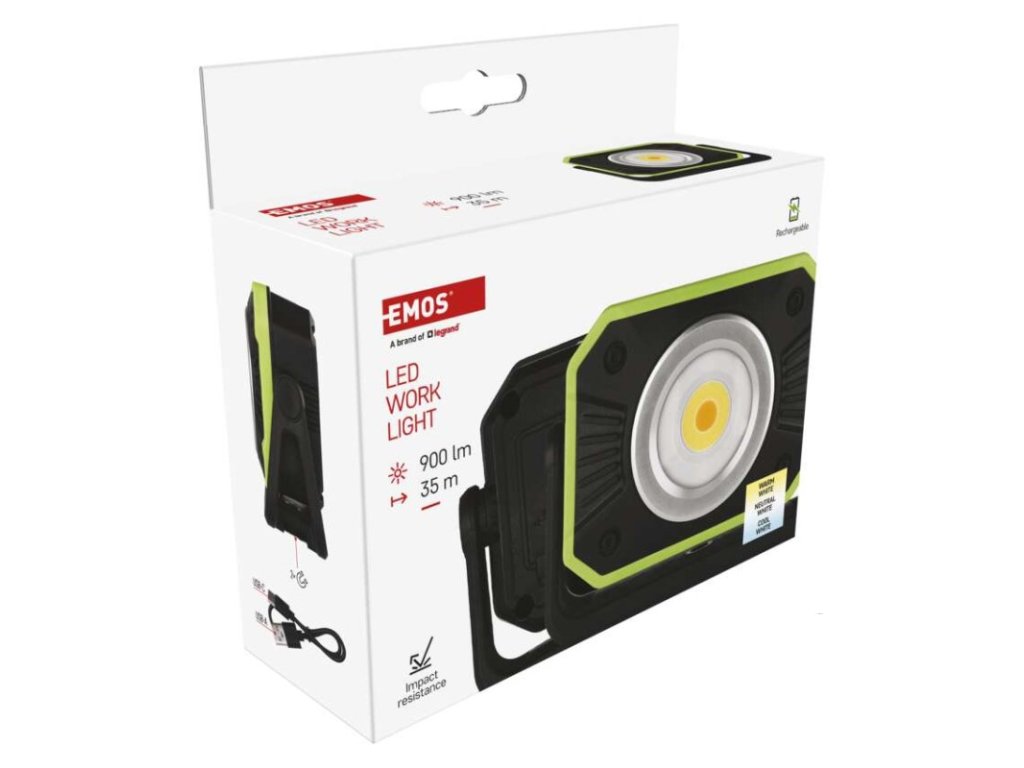 barva: černo-zelená|baterie součástí balení: ano|doba nabíjení: 4,5 h|doba svícení: 3,5–12,5 h|doba svícení detail: COB LED 100 % – 3,5 h, COB LED 70 % – 5 h, COB LED 50 % – 7 h, COB LED 25 % – 12,5 h|dosvit: COB LED 100 % – 35 m, COB LED 70 % – 30 m, COB LED 50 % – 25 m, COB LED 25 % – 20 m|fokus: ne|hmotnost: 325 g|LED indikace nabíjení: ano|LED indikace stavu akumulátoru: ano|materiál: plast|maximální dosvit: 35 m|maximální světelný tok: 900 lm|nabíjecí: ano|napájení: Li-Ion|nárazuvzdornost: ano|počet režimů svícení: 16|příslušenství: USB kabel|prodejní obal: 1 ks, krabice|režimy svícení: neuvádí se|rozměr: 125 × 45 × 95 mm|speciální funkce: funkce ochrany baterie, funkce powerbank|světelný tok: COB LED 100 % – 900 lm, COB LED 70 % – 670 lm, COB LED 50 % – 450 lm, COB LED 25 % – 225 lm|typ baterie: 4 400 mAh/3,7 V|typ napájecího konektoru: USB C|voděodolnost: neuvádí se|vybavení: magnet, otočný stojánek, háček|záruční doba: 2 roky|zdroj světla: COB LED studená + COB LED teplá|značka: EMOSDoplňkové parametry