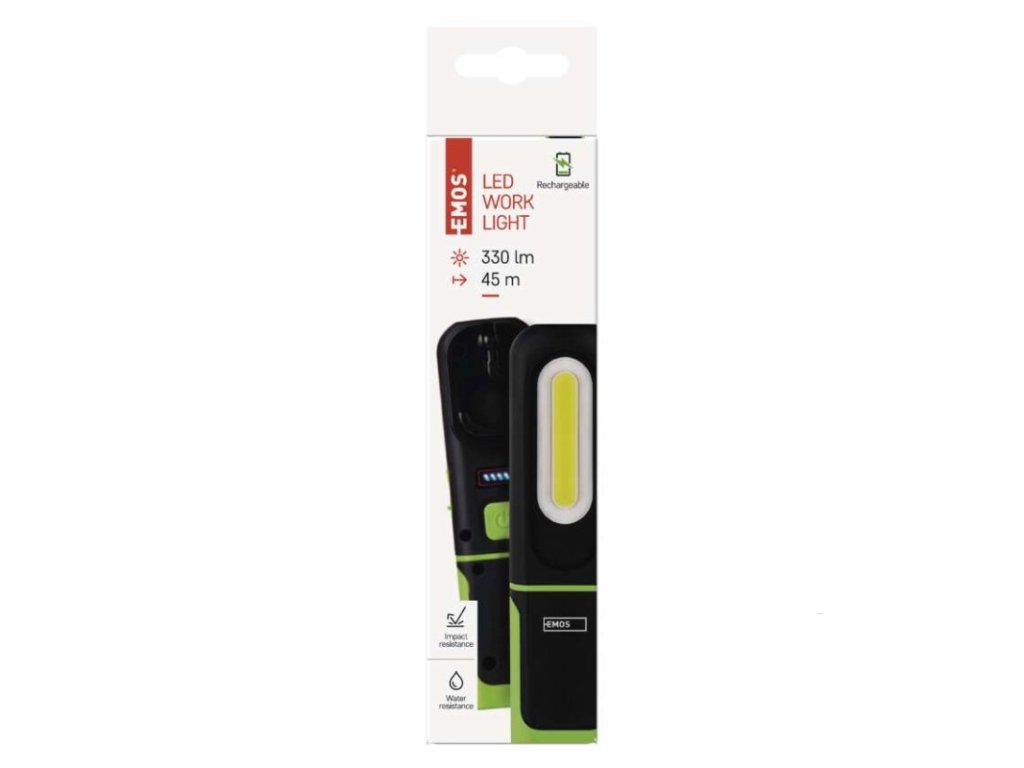 barva: zeleno-černá|baterie součástí balení: ano|doba nabíjení: 2–4 h|doba svícení: 3–7 h|doba svícení detail: COB LED 100 % – 3 h, COB LED 33 % – 5,5 h, SMD LED 100 % – 7 h|dosvit: COB LED 100 % – 25 m, COB LED 33 % – 15 m, SMD LED 100 % – 45 m|fokus: ne|hmotnost: 110 g|LED indikace nabíjení: ano|LED indikace stavu akumulátoru: ano|materiál: ABS plast + guma|maximální dosvit: 45 m|maximální světelný tok: 330 lm|nabíjecí: ano|napájení: Li-Ion|nárazuvzdornost: ano|počet režimů svícení: 3|příslušenství: USB kabel|prodejní obal: 1 ks, krabice|režimy svícení: COB LED 100 %, COB LED 33 %, SMD LED 100 %|rozměr: 41 × 29 × 154 mm|speciální funkce: funkce rychlého vypnutí, funkce ochrany baterie|světelný tok: COB LED 100 % – 330 lm, COB LED 33 % – 100 lm, SMD LED 100 % – 60 lm|typ baterie: 1 200 mAh/3,7 V|typ napájecího konektoru: USB C|voděodolnost: ano (IP43)|vybavení: otoč. nakl. rukojeť, 1× klip, magnet, hák|záruční doba: 2 roky|zdroj světla: COB LED + SMD LED|značka: EMOSDoplňkové parametry