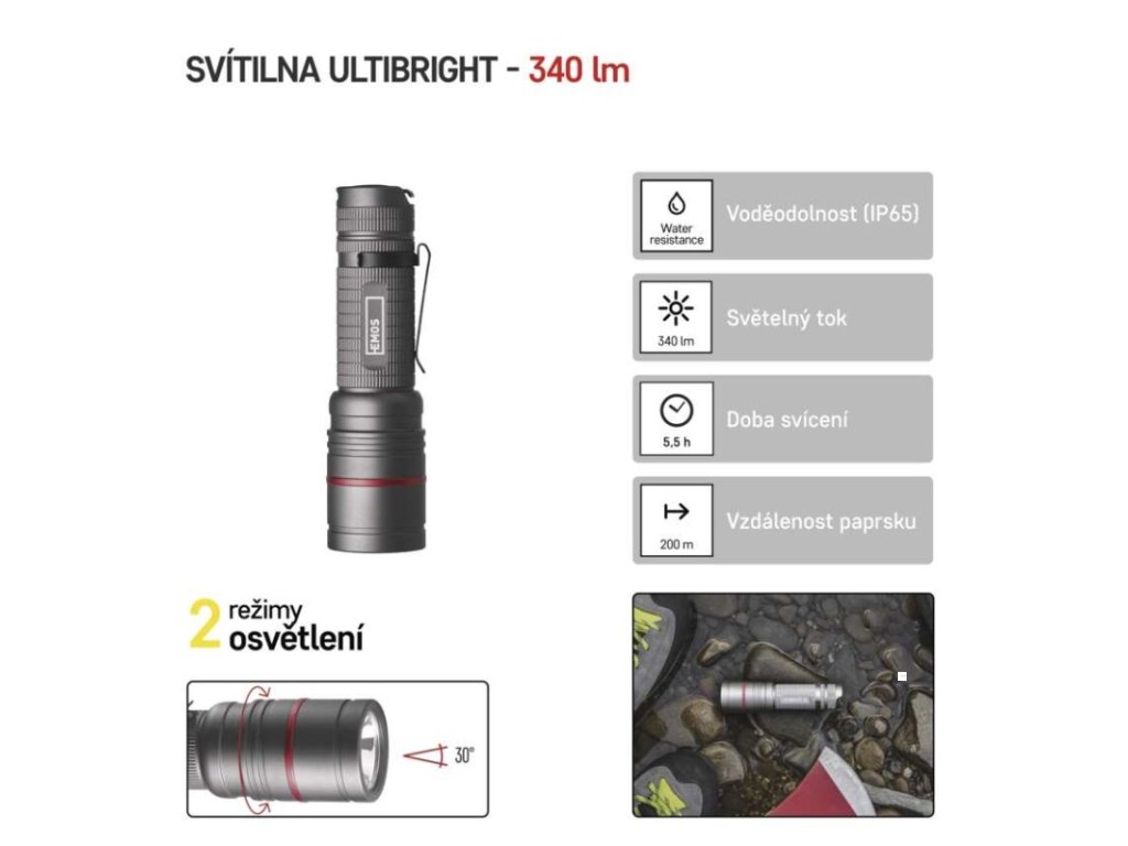 barva: šedá|baterie součástí balení: ne|doba nabíjení: neuvádí se|doba svícení: 3–5,5 h|doba svícení detail: CREE LED 100 % – 3 h, CREE LED 50 % – 5,5 h|dosvit: CREE LED 100 % – 200 m, CREE LED 50 % – 130 m|fokus: ano (šroubovací)|hmotnost: 112 g|LED indikace nabíjení: neuvádí se|LED indikace stavu akumulátoru: neuvádí se|materiál: hliník|maximální dosvit: 200 m|maximální světelný tok: 340 lm|nabíjecí: ne|napájení: 3× AAA|nárazuvzdornost: ano|počet režimů svícení: 2|příslušenství: neuvádí se|prodejní obal: 1 ks, krabice|režimy svícení: CREE LED 100 %, CREE LED 50 %|rozměr: 124 × 34 × 34 mm|speciální funkce: neuvádí se|světelný tok: CREE LED 100 % – 340 lm, CREE LED 50 % – 160 lm|typ baterie: LR03 (1,5 V)|typ napájecího konektoru: neuvádí se|voděodolnost: ano (IP65)|vybavení: klip, poutko|záruční doba: 3 roky|zdroj světla: CREE LED|značka: EMOSDoplňkové parametry