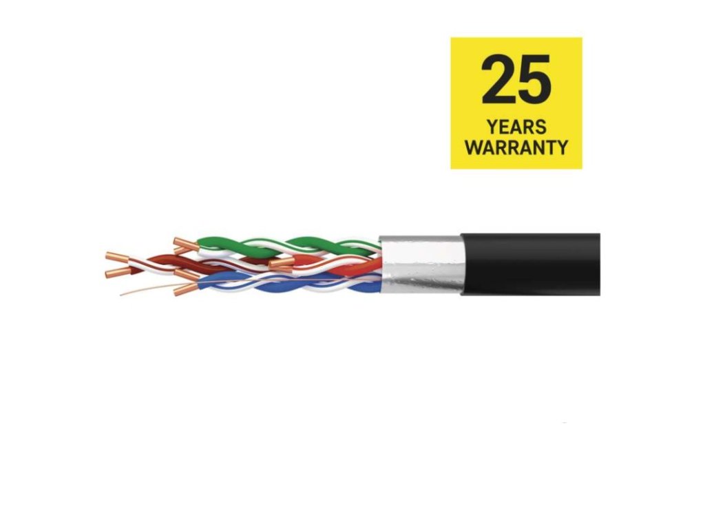 AWG: 24|barva pláště: černá (RAL 9005)|délka: 100 m|izolace vodičů: HDPE|kategorie: CAT5E|konstrukce kabelu: drát|materiál vnitřního vodiče: měď (Cu)|maximální provozní vlhkost: 93 %|montážní teplota: +5 °C až +60 °C|nebezpečné látky: žádné|nejvyšší podporovaný protokol: 1000 Base-TX (Gigabit Ethernet)|osazené konektory: ne|plášť kabelu: PE|plášť se sníženou kouřivostí LSZH (LS0H): ne|počet vodičů: 8|použití: professional|prodejní obal: 100 m, papírová krabice|produkt: UTP kabel bez konektorů|průměr kabelu: 5 mm|průměr vnitřního vodiče: 0,48 mm|skladovací teplota: -20 °C až +60 °C|stínění: ne|tahový prvek: –|tloušťka izolace vodičů: 0,22 mm|tloušťka pláště: 1,0 mm|třída reakce na oheň: Eca|typ: FTP CAT 5E PE|typ ochrany konektorů: –|určeno pro kabel: –|záruční doba: 25 let|značení kabelu: FTP Cat5E PE OUTDOOR 1 – 100 mDoplňkové parametry