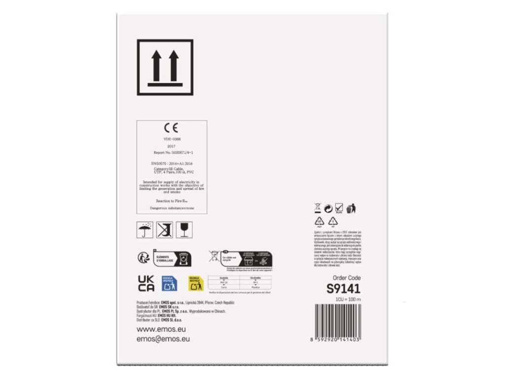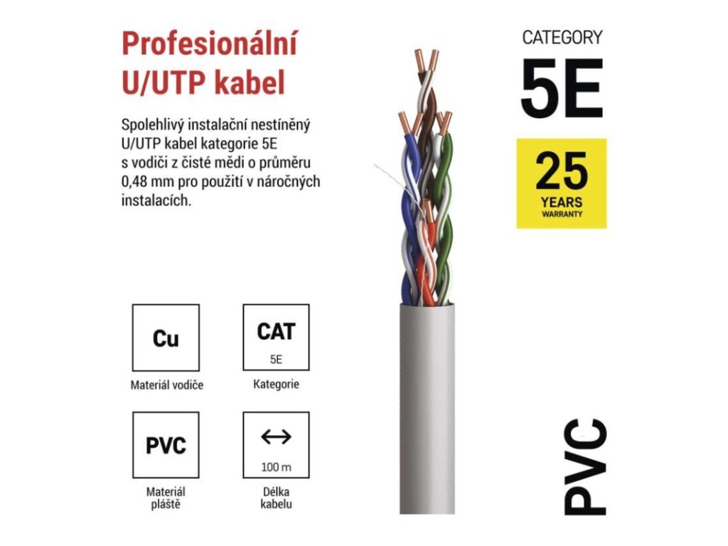 AWG: 24|barva pláště: šedá (RAL 7035)|délka: 100 m|izolace vodičů: HDPE|kategorie: CAT5E|konstrukce kabelu: drát|materiál vnitřního vodiče: měď (Cu)|maximální provozní vlhkost: 93 %|montážní teplota: +5 °C až +60 °C|nebezpečné látky: žádné|nejvyšší podporovaný protokol: 1000 Base-TX (Gigabit Ethernet)|osazené konektory: neuvádí se|plášť kabelu: PVC|plášť se sníženou kouřivostí LSZH (LS0H): ne|počet vodičů: 8|použití: professional|prodejní obal: 100 m, papírová krabice|produkt: UTP kabel bez konektorů|průměr kabelu: 5 mm|průměr vnitřního vodiče: 0,48 mm|skladovací teplota: -20 °C až +60 °C|stínění: ne|tahový prvek: neuvádí se|tloušťka izolace vodičů: 0,22 mm|tloušťka pláště: 1,0 mm|třída reakce na oheň: Eca|typ: UTP CAT 5E PVC|typ ochrany konektorů: neuvádí se|určeno pro kabel: neuvádí se|záruční doba: 25 let|značení kabelu: UTP Cat5E PVC 1 – 100 mDoplňkové parametry