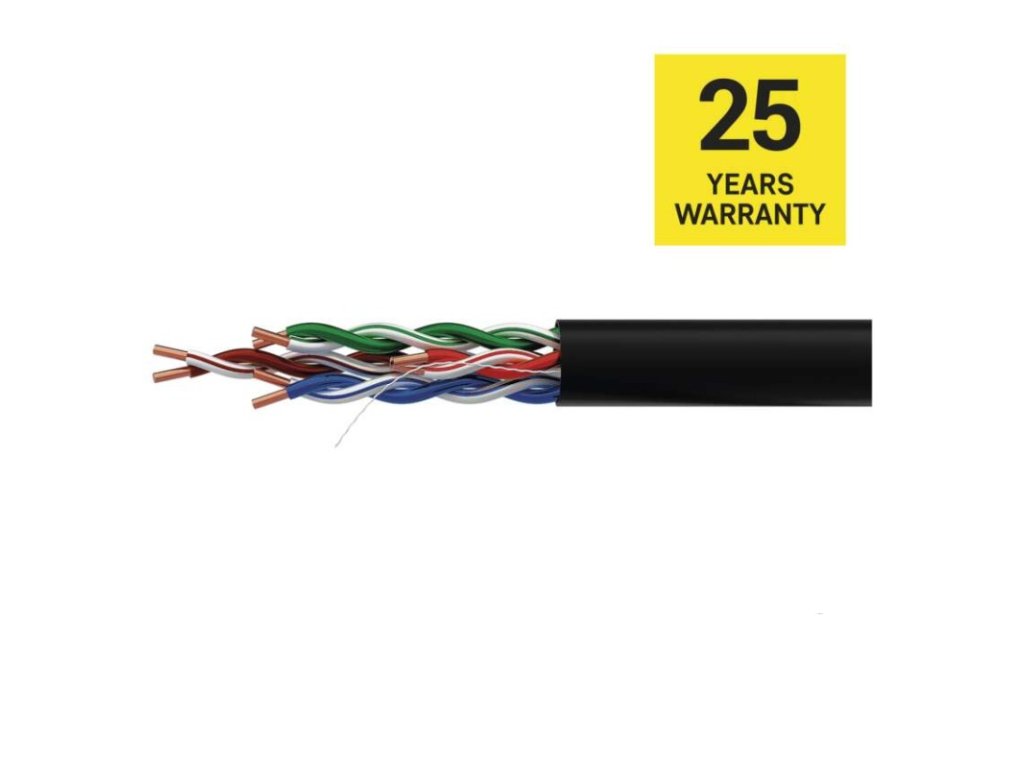 AWG: 24|barva pláště: černá (RAL 9005)|délka: 100 m|izolace vodičů: HDPE|kategorie: CAT5E|konstrukce kabelu: drát|materiál vnitřního vodiče: měď (Cu)|maximální provozní vlhkost: 93 %|montážní teplota: +5 °C až +60 °C|nebezpečné látky: žádné|nejvyšší podporovaný protokol: 1000 Base-TX (Gigabit Ethernet)|osazené konektory: ne|plášť kabelu: PE|plášť se sníženou kouřivostí LSZH (LS0H): ne|počet vodičů: 8|použití: professional|prodejní obal: 100 m, papírová krabice|produkt: UTP kabel bez konektorů|průměr kabelu: 5 mm|průměr vnitřního vodiče: 0,48 mm|skladovací teplota: -20 °C až +60 °C|stínění: ne|tahový prvek: –|tloušťka izolace vodičů: 0,22 mm|tloušťka pláště: 1,0 mm|třída reakce na oheň: Eca|typ: UTP CAT 5E PE|typ ochrany konektorů: –|určeno pro kabel: –|záruční doba: 25 let|značení kabelu: UTP Cat5E PE OUTDOOR 1 – 100 mDoplňkové parametry