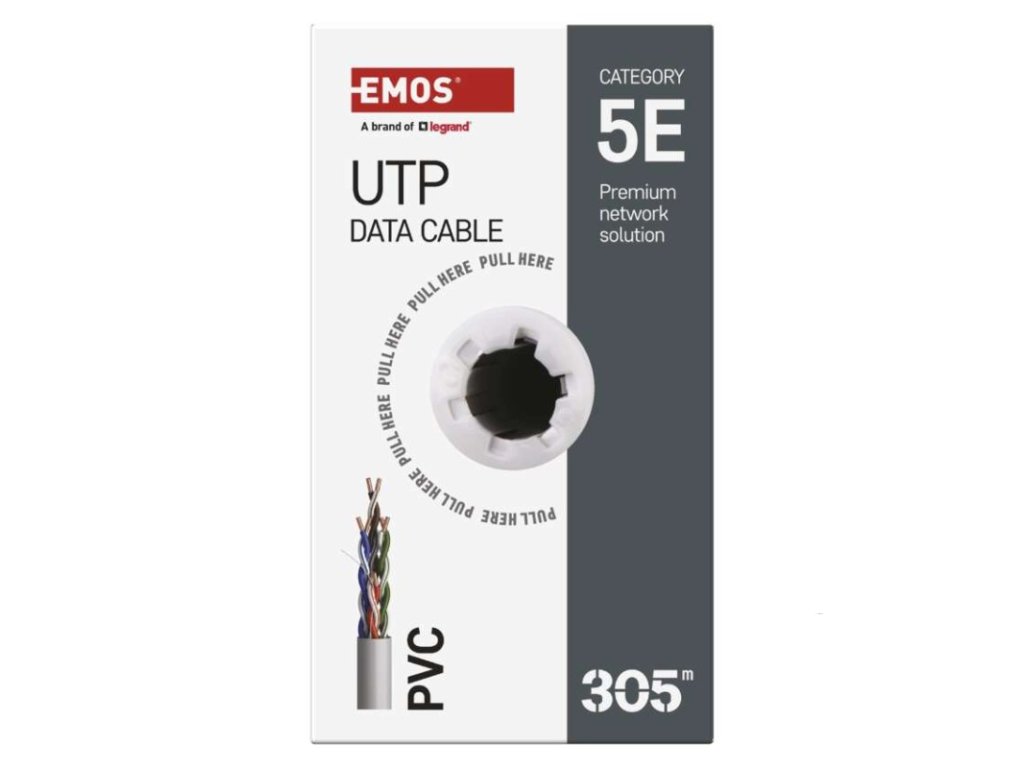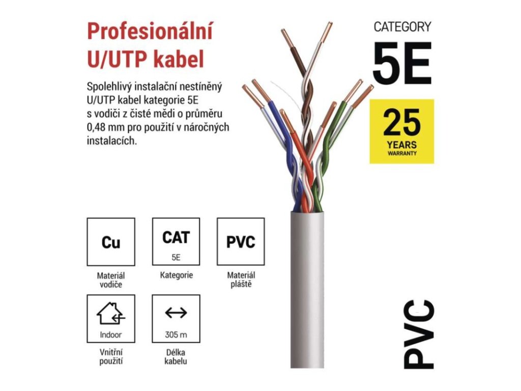 AWG: 24|barva pláště: šedá (RAL 7035)|délka: 305 m|izolace vodičů: HDPE|kategorie: 5E|konstrukce kabelu: drát|materiál vnitřního vodiče: měď (Cu)|maximální provozní vlhkost: 93 %|montážní teplota: +5 °C až +60 °C|nebezpečné látky: žádné|nejvyšší podporovaný protokol: 1000 Base-T (Gigabit Ethernet)|osazené konektory: ne|plášť kabelu: PVC|plášť se sníženou kouřivostí LSZH (LS0H): ne|počet vodičů: 8|použití: neuvádí se|prodejní obal: 305 m, papírová krabice|produkt: UTP kabel bez konektorů|průměr kabelu: 5,2 mm|průměr vnitřního vodiče: 0,50 mm|skladovací teplota: -20 °C až +60 °C|stínění: ne|tahový prvek: Nylon 150D|tloušťka izolace vodičů: 0,22 mm|tloušťka pláště: 1,1 mm|třída reakce na oheň: Eca|typ: UTP CAT 5E PVC|typ ochrany konektorů: ne|určeno pro kabel: neuvádí se|záruční doba: 25 let|značení kabelu: UTP Cat5E PVC 1 – 305 mDoplňkové parametry