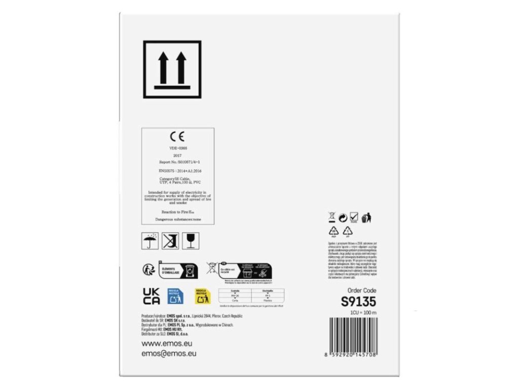 AWG: 24|barva pláště: šedá (RAL 7035)|délka: 100 m|izolace vodičů: HDPE|kategorie: CAT5E|konstrukce kabelu: drát|materiál vnitřního vodiče: měď (Cu)|maximální provozní vlhkost: 93 %|montážní teplota: +5 °C až +60 °C|nebezpečné látky: žádné|nejvyšší podporovaný protokol: 1000 Base-T (Gigabit Ethernet)|osazené konektory: neuvádí se|plášť kabelu: PVC|plášť se sníženou kouřivostí LSZH (LS0H): ne|počet vodičů: 8|použití: vnitřní|prodejní obal: 100 m, papírová krabice|produkt: UTP kabel bez konektorů|průměr kabelu: 5,0 mm|průměr vnitřního vodiče: 0,45 mm|skladovací teplota: -20 °C až +60 °C|stínění: ne|tahový prvek: Nylon 150D|tloušťka izolace vodičů: 0,21 mm|tloušťka pláště: 1,0 mm|třída reakce na oheň: Eca|typ: UTP CAT 5E PVC BASIC|typ ochrany konektorů: neuvádí se|určeno pro kabel: neuvádí se|záruční doba: 2 roky|značení kabelu: UTP Cat5E PVC 1 – 100 mDoplňkové parametry