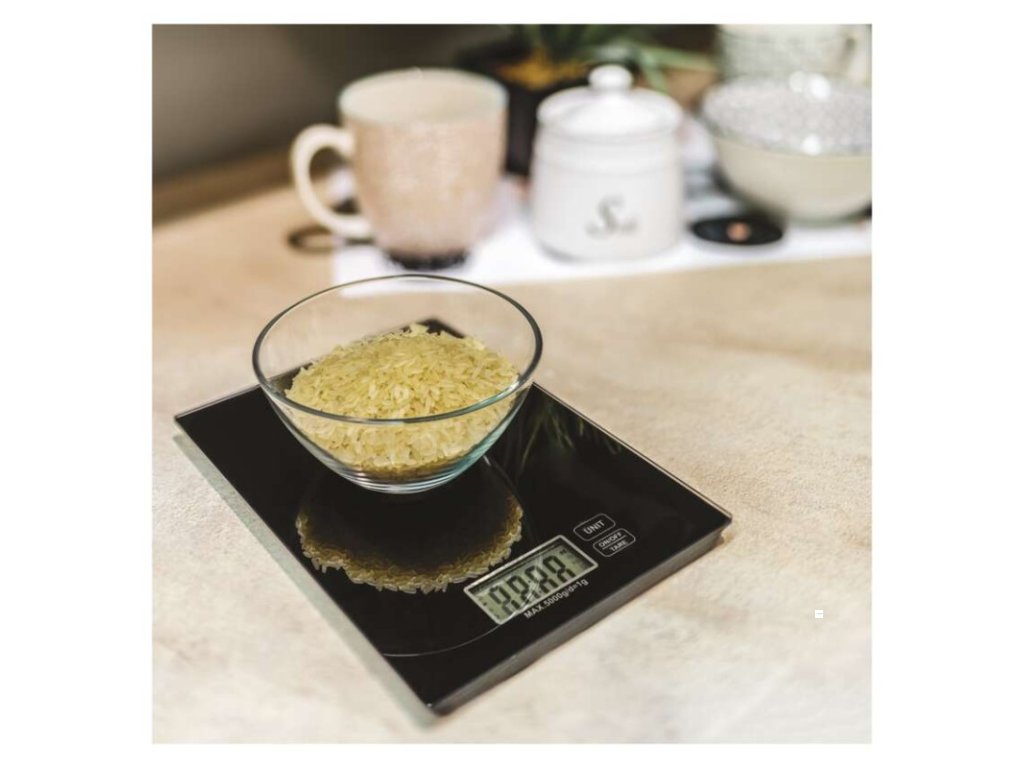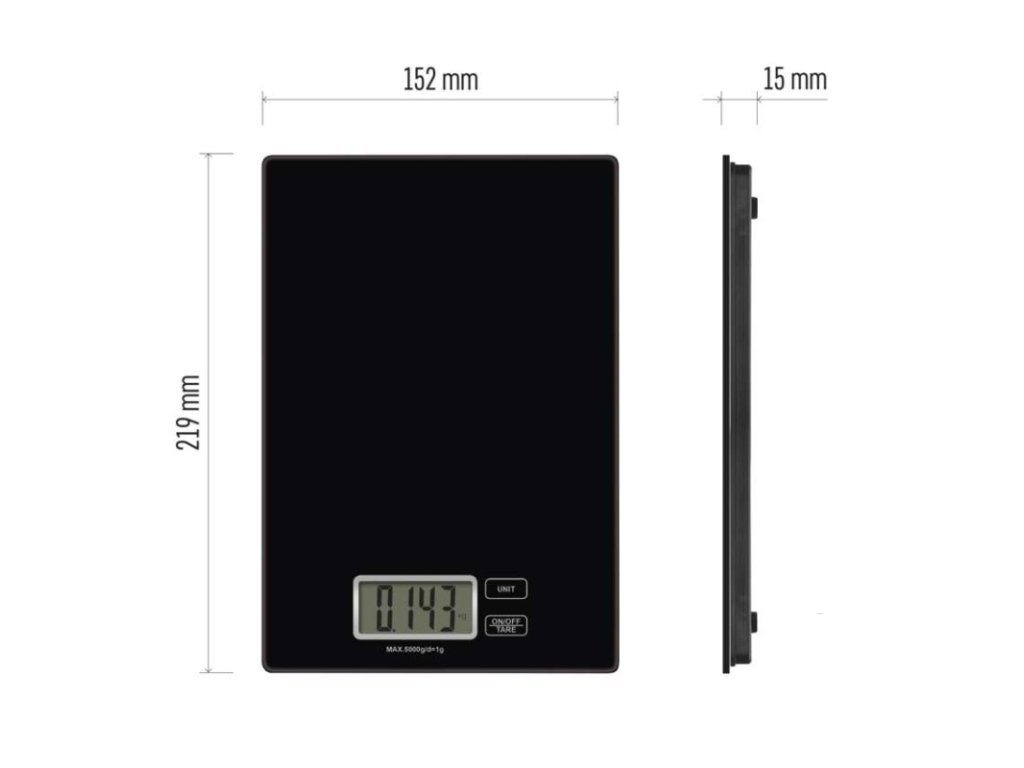 automatické vypnutí: po 2 minutách|barva: černá|Bluetooth: ne|BMI index – měření tuku, vody a svalové hmoty: ne|funkce dovažování: ano|indikace slabých baterií: ano|indikátor přetížení: ano|jednotky váhy: g, oz, lb, kg|LCD displej: ano|max. zátěž: 5 kg|napájení: 1× 3 V CR2032 (součástí balení)|paměť: ne|podsvícený displej: ne|povrch váhy: tvrzené sklo|přesnost vážení: 1 g|prodejní obal: 1 ks, krabička|produkt: kuchyňská váha|rozměr: 15 × 152 × 219 mmDoplňkové parametry