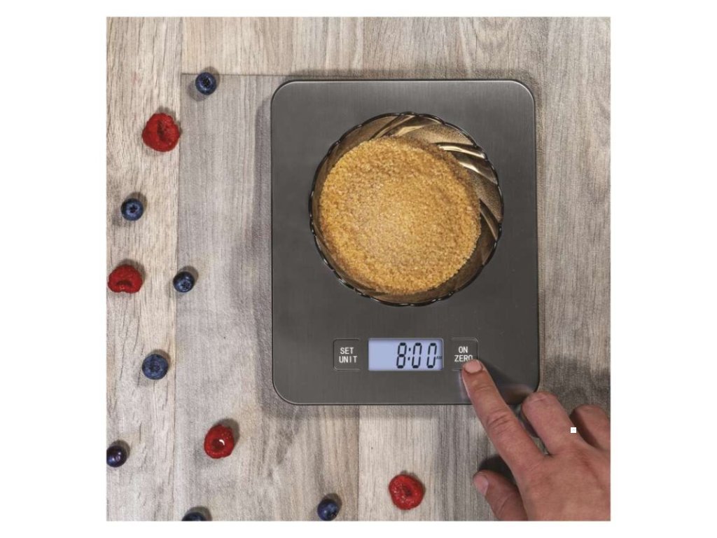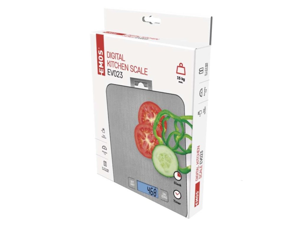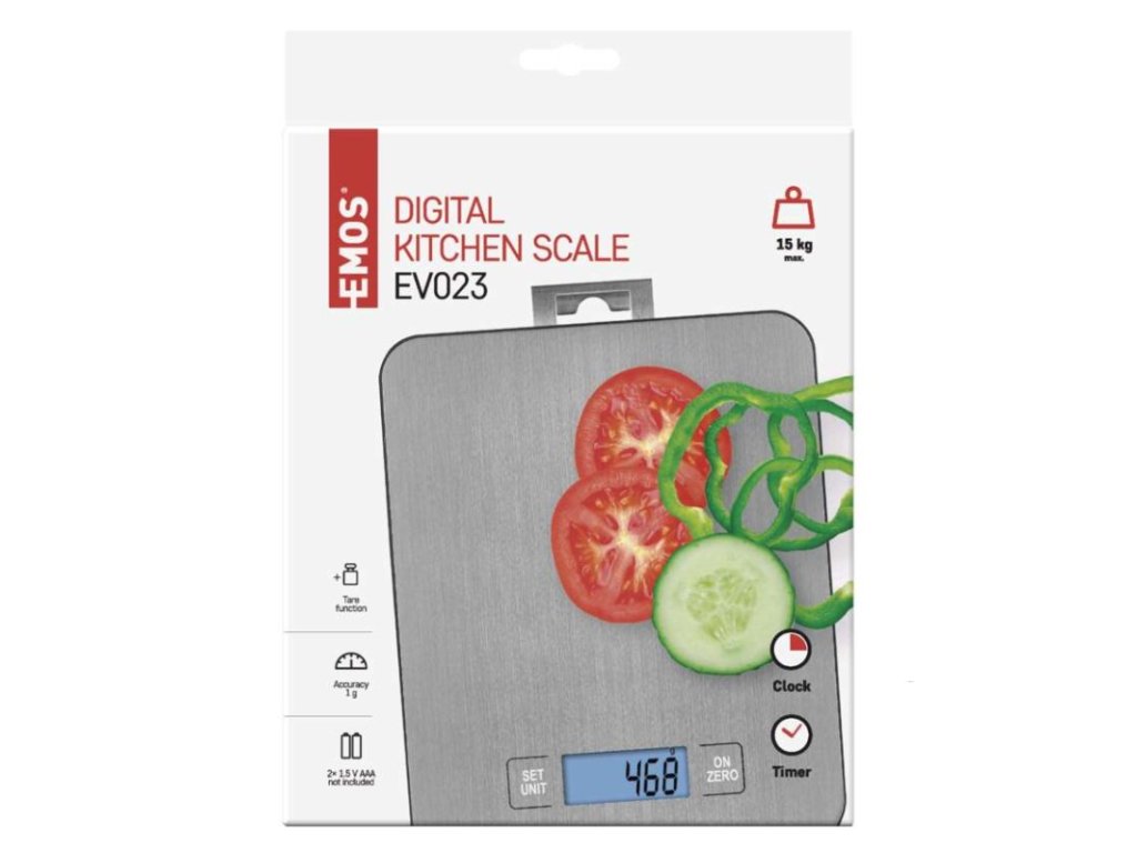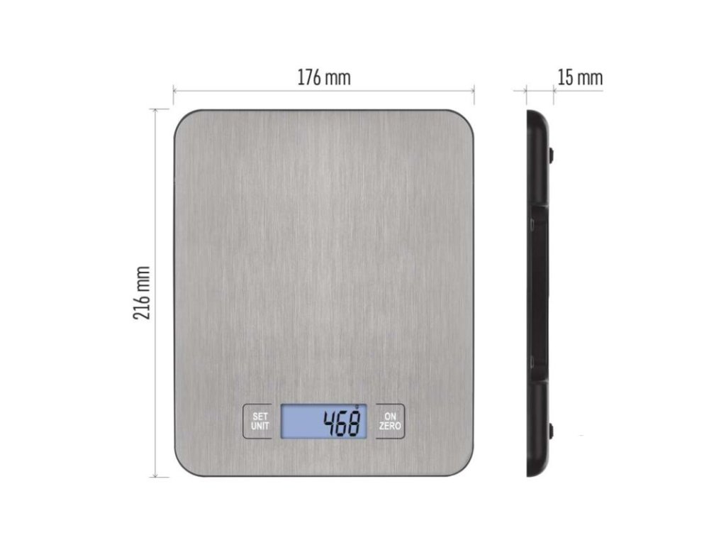 automatické vypnutí: po 35 sekundách|barva: stříbrná|Bluetooth: ne|BMI index – měření tuku, vody a svalové hmoty: ne|funkce dovažování: ano|indikace slabých baterií: ano|indikátor přetížení: ano|jednotky váhy: g, kg, lb, oz|LCD displej: ano|max. zátěž: 15 kg|napájení: 2× 1,5 V AAA (nejsou součástí balení)|paměť: ne|podsvícený displej: ano|povrch váhy: nerez|přesnost vážení: 1 g|prodejní obal: 1 ks, krabička|produkt: kuchyňská váha|rozměr: 15 × 176 × 216 mmDoplňkové parametry