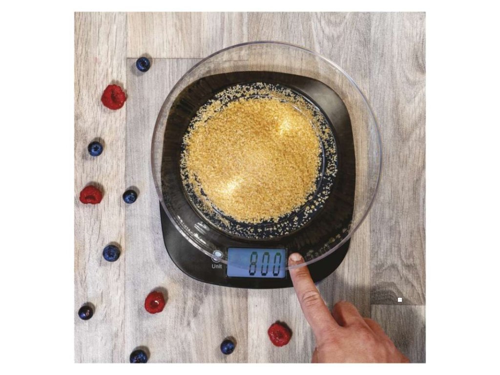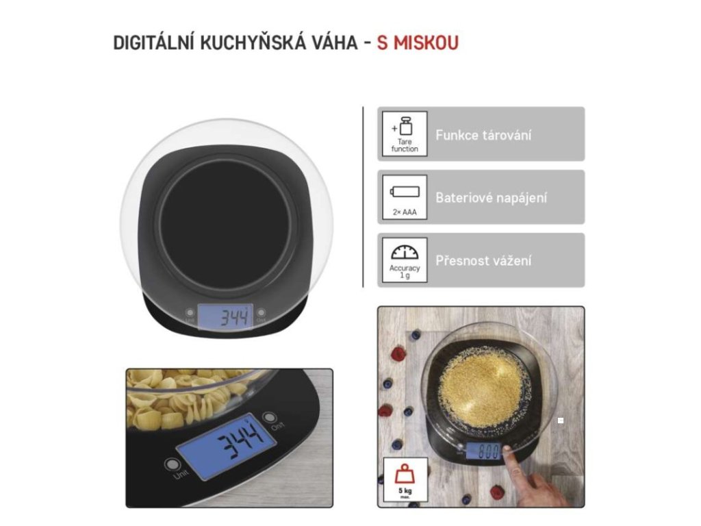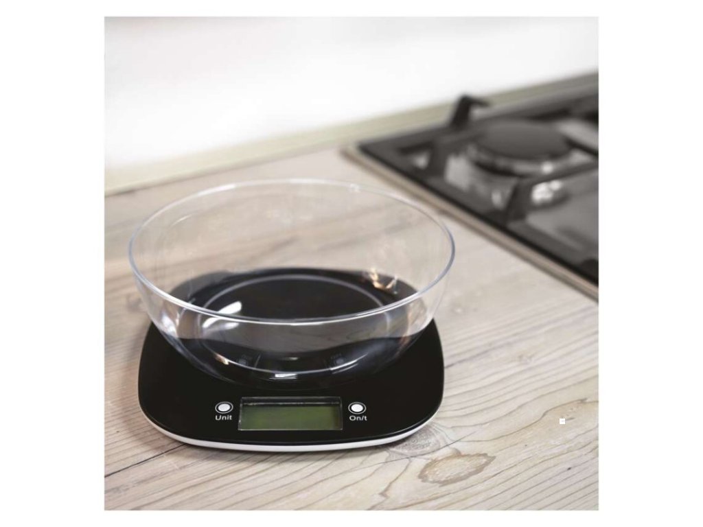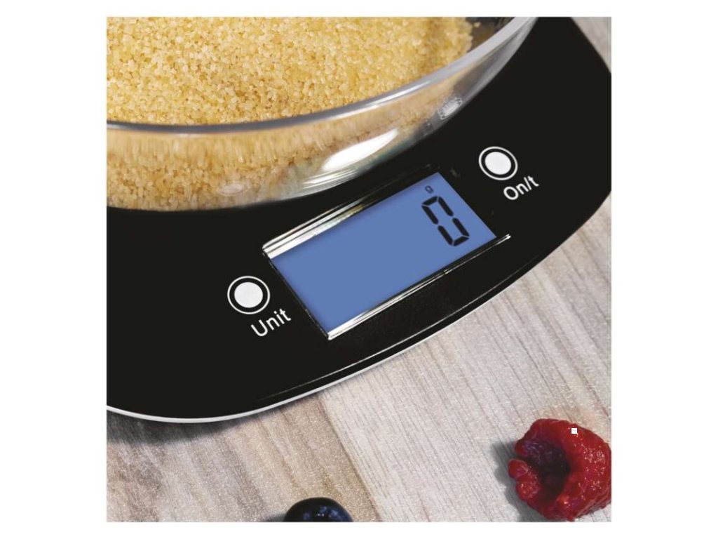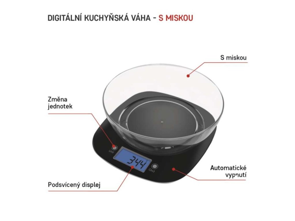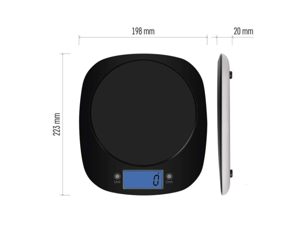 automatické vypnutí: po 2 minutách|barva: černá|Bluetooth: ne|BMI index – měření tuku, vody a svalové hmoty: ne|funkce dovažování: ano|indikace slabých baterií: ano|indikátor přetížení: ano|jednotky váhy: g, oz, lb, kg, ml|LCD displej: ano|max. zátěž: 5 kg|napájení: 2× 1,5 V AAA (nejsou součástí balení)|paměť: ne|podsvícený displej: ano|povrch váhy: ABS plast|přesnost vážení: 1 g|prodejní obal: 1 ks, krabice|produkt: kuchyňská váha|rozměr: 20 × 198 × 223 mmDoplňkové parametry
