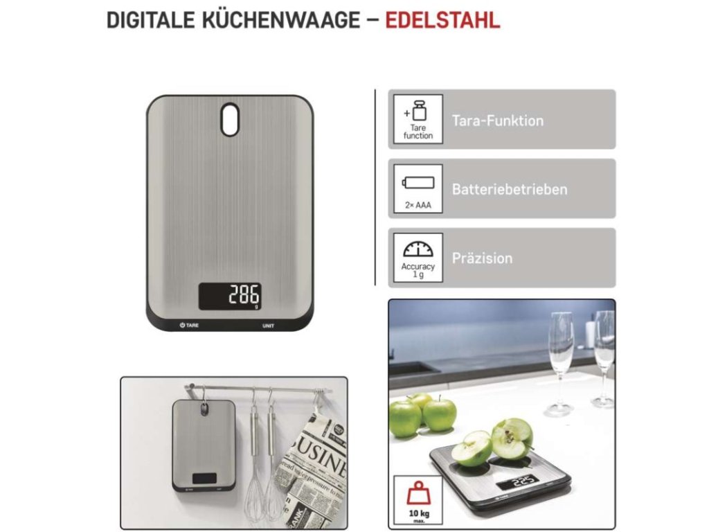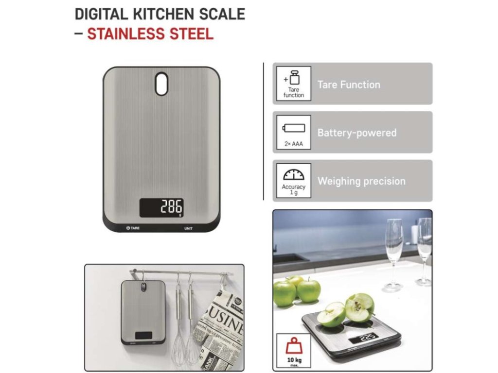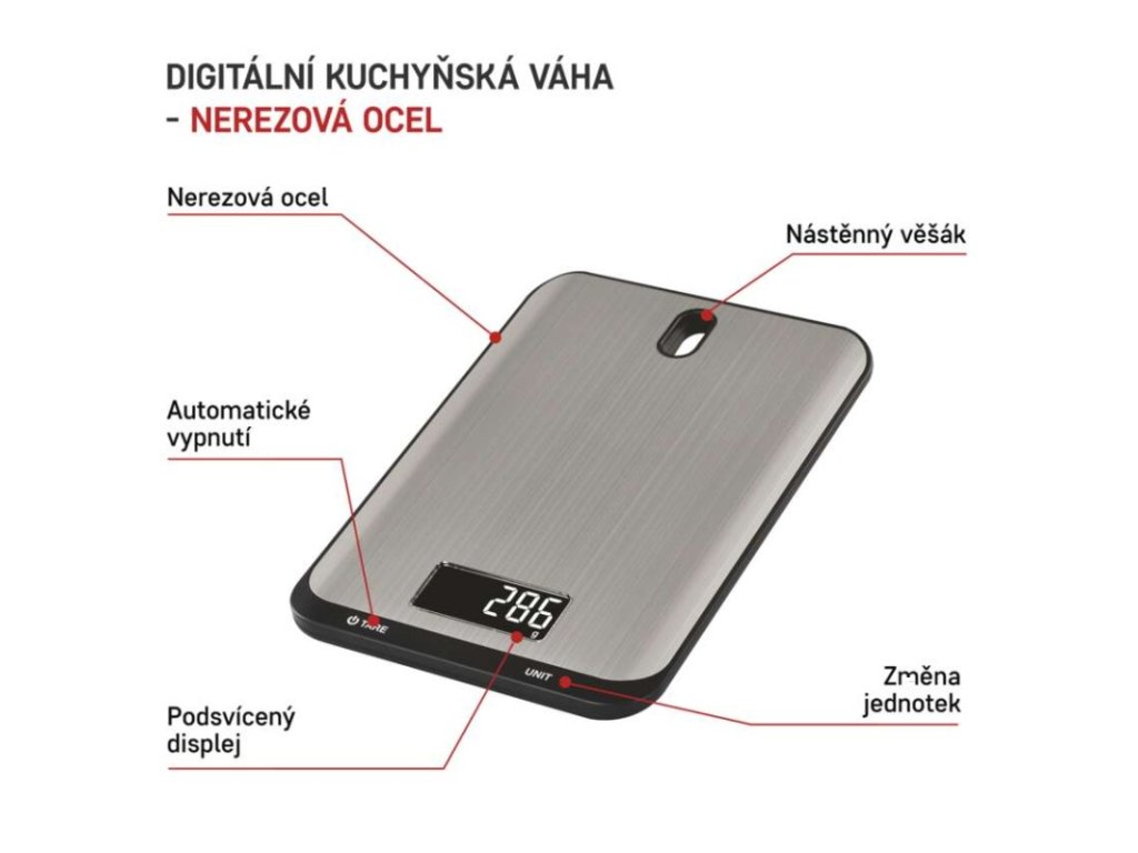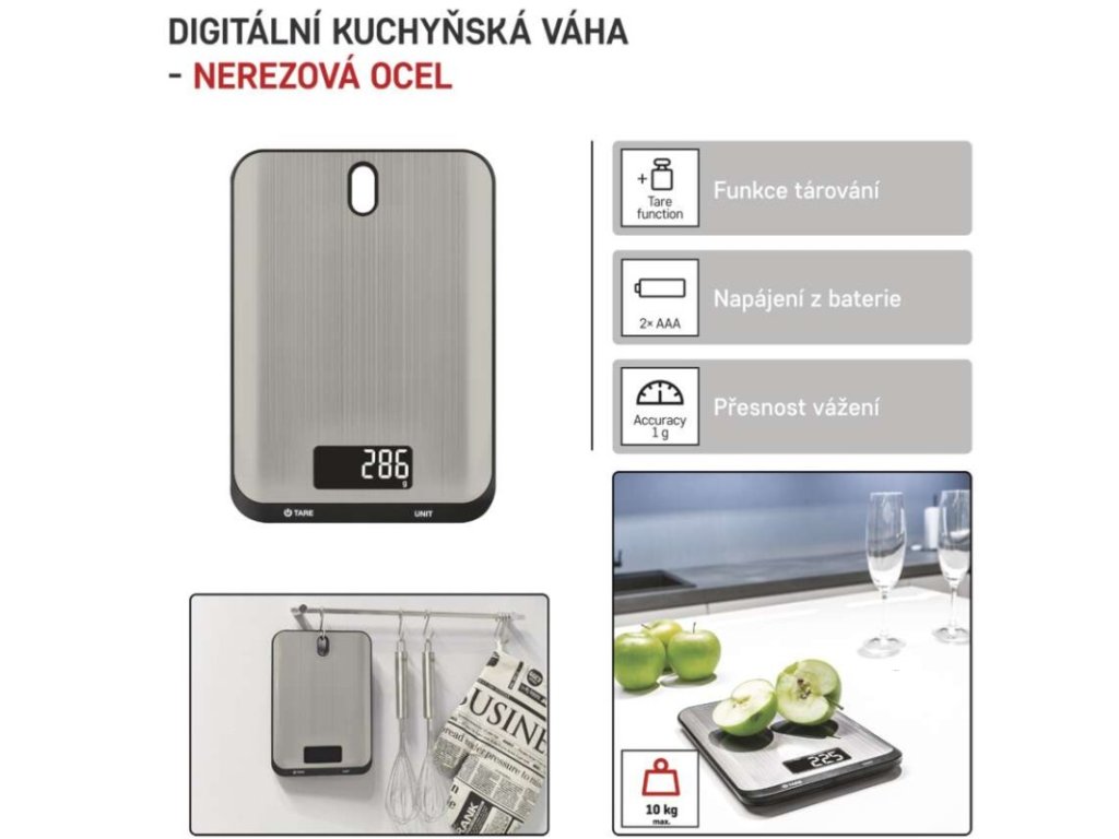 automatické vypnutí: po 90 sekundách|barva: stříbrná|Bluetooth: ne|BMI index – měření tuku, vody a svalové hmoty: ne|funkce dovažování: ano|indikace slabých baterií: ano|indikátor přetížení: ano|jednotky váhy: g, kg, ml, oz, lb, tl|LCD displej: ano|max. zátěž: 10 kg|napájení: 2× 1,5 V AAA (součástí balení)|paměť: ne|podsvícený displej: ano|povrch váhy: nerez|přesnost vážení: 1 g|prodejní obal: 1 ks, krabička|produkt: kuchyňská váha|rozměr: 15 × 153 × 212 mmDoplňkové parametry