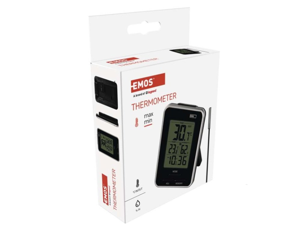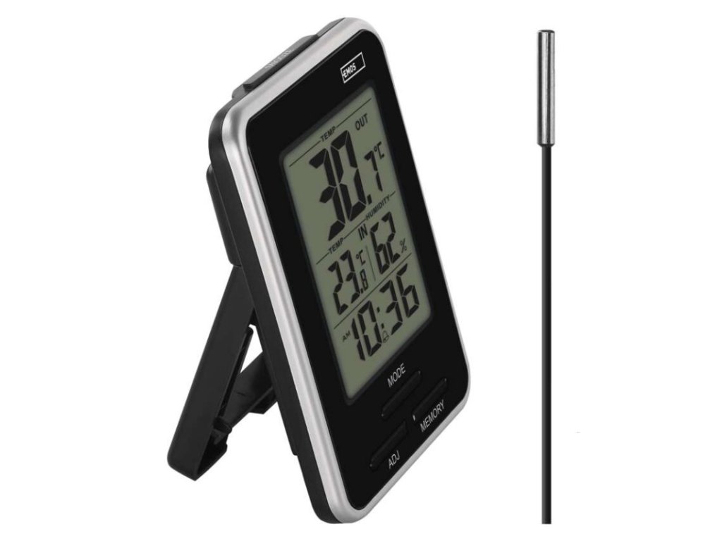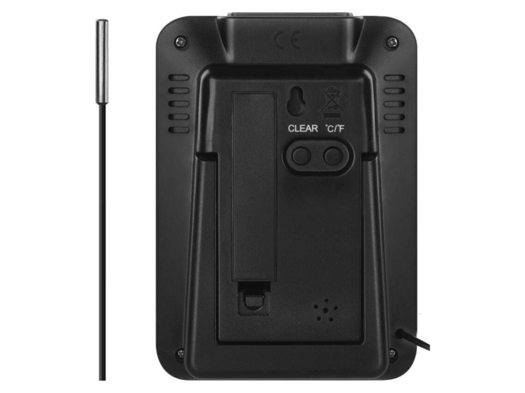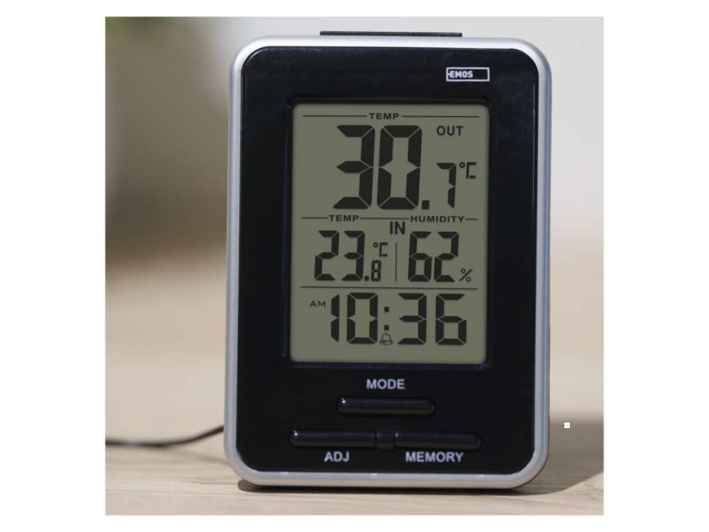 Digitální teploměr s vhlkoměrem, drátové čidlo, budík E0121