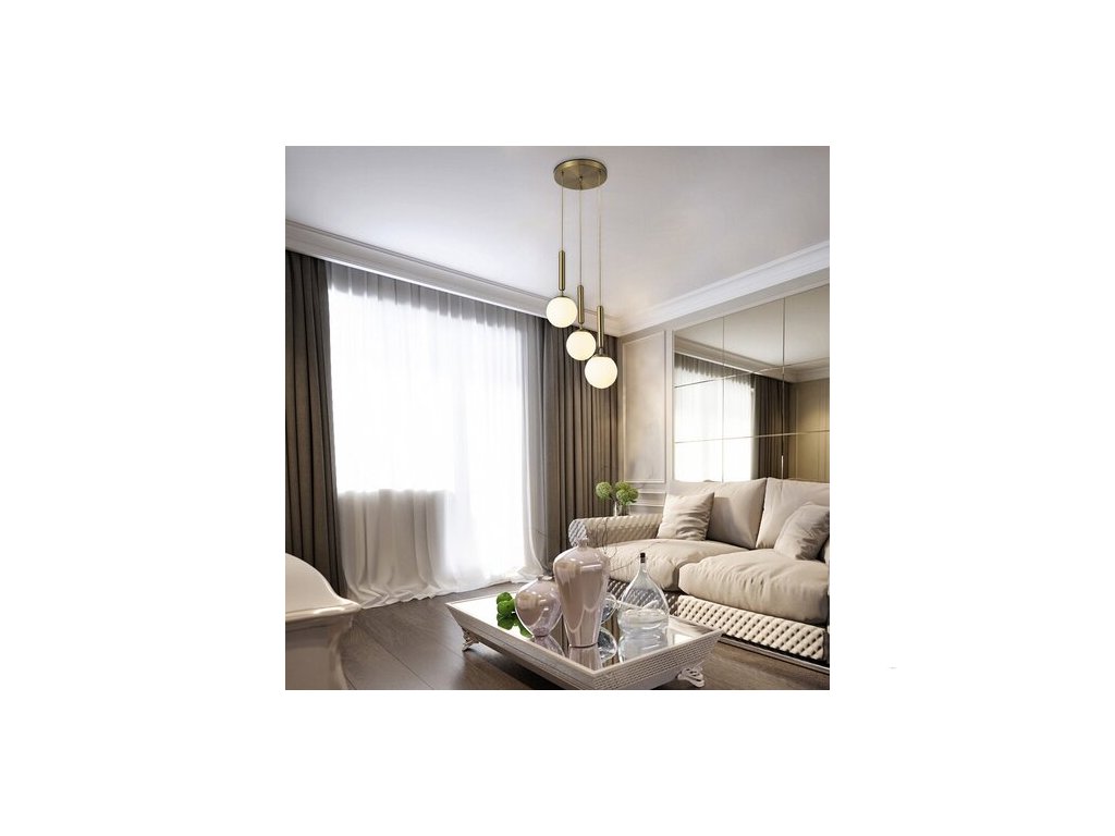 Trojité závěsné svítidlo Divina je skvělou volbou pro každého, kdo miluje moderní styl, ale má rád i elegantní tvary. Zlatá barva svítidla a kombinace stínítek z bílého skla budou vypadat dobře v každém interiéru jídelny. Svítidlo Divina může být použito s třemi energeticky úspornými světelnými zdroji s výkonem každý do 9 W, patice typu E14. Šířka svítidla je 370 mm a jeho vzdálenost od stropu je 1200 mm. Trojité závěsné svítidlo Divina se dodává bez světelného zdroje.