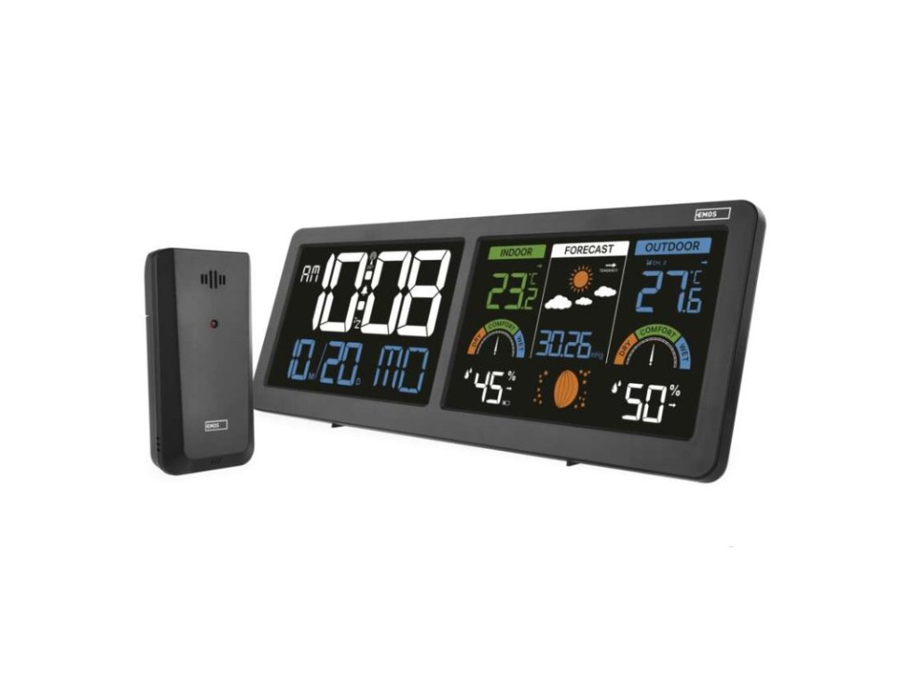 12/24 formát času: ano|anemometr: ne|barevný displej (black mask) podsvícený: ano|barometr: ano|budík: ano|časová pásma: ano|další funkce: –|datum: ano|dosah čidla: až 80 m|drátová sonda k čidlu: ne|elektronické plošné podsvícení: ano|fáze měsíce: ano|hodiny: řízené DCF signálem|kalendář: ano|kompatibilita: –|korekce nadmořské výšky: ne|LED podsvícení displeje: ano|min. a max. teplota: ano|možné další čidlo: až 3 čidla (E05018)|možnost nastavení jednotky teploty: °C/°F|možnost pověšení na zeď: ano|napájení čidla: 2× 1,5 V AAA (nejsou součástí balení)|napájení stanice: 3× 1,5 V AAA (nejsou součástí balení)|notifikace do mobilní aplikace: ne|opakované buzení: ano|ovládání hlasovými asistenty: ne|podporované OS: –|předpověď počasí: ano|přenosová frekvence: 433 MHz|prodejní obal: 1 ks, krabička|produkt: meteostanice|projekce: ne|protokol: –|provedení: bezdrátové|rozměr čidla: 50 × 25 × 95 mm|rozměr hlavní jednotky: 284 × 25 × 107 mm|síťový adaptér: ano, 5 V DC/1 000 mA (součástí balení)|srážkoměr: ne|teplotní výstraha: ano|trend teploty: ano|trend tlaku: ano|trvalé podsvícení: ano|velikost displeje: 2× 125 × 80 mm|venkovní teplota: -40 °C až +70 °C, rozlišení 0,1 °C|venkovní vlhkost: 20 % až 99 % RV, rozlišení 1 %|vnitřní teplota: 0 °C až +50 °C, rozlišení 0,1 °C|vnitřní vlhkost: 20 % až 99 % RV, rozlišení 1 %Doplňkové parametry