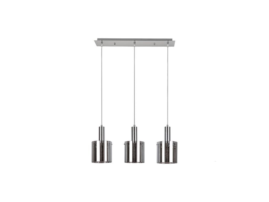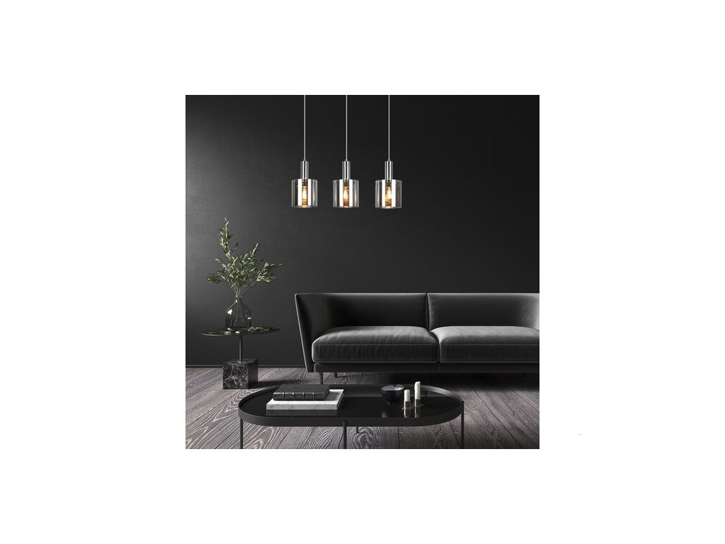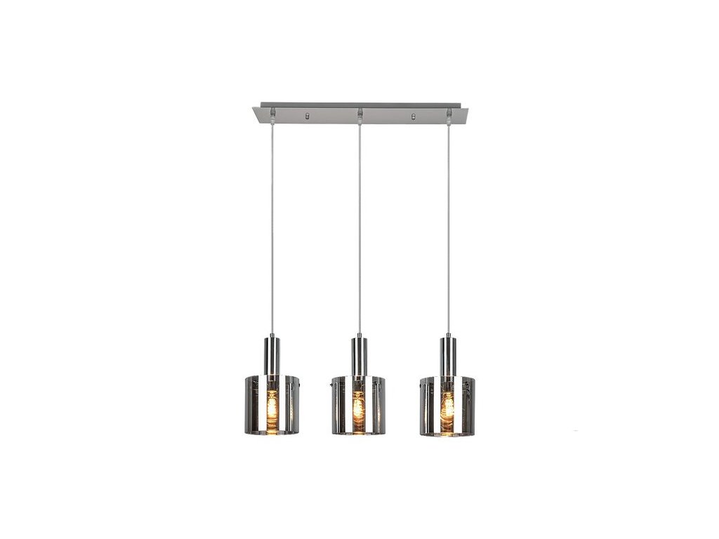 Trojité závěsné svítidlo Donati v moderním stylu bude nádherným kouskem nábytku do obývacího pokoje, kuchyně, jídelny nebo ložnice. Kovové hlavy svítidla v chromové barvě jsou doplněny válcovými stínítky z tónovaného skla. Svítidlo lze připevnit ke stropu pomocí prodloužené čtvercové dekorativní základny. Tónovaná stínítka umožňují částečně vidět žárovky a současně filtrují jejich světlo, takže svítidlo Donati zajišťuje velmi útulné osvětlení. Závěsné svítidlo je možné použít s třemi žárovkami, každá s výkonem až 60W. Typ zásuvky je E27. Pokud chcete zvýšit intimní a útulnou atmosféru, vyberte si do tohoto svítidla žárovky vyzařující teplé bílé světlo. Rozměry trojitého závěsného svítidla Donati jsou následující: šířka 600 mm, průměr každého stínítka je 150 mm, vzdálenost od stropu 1 200 mm. Tento model je dodáván bez světelných zdrojů.