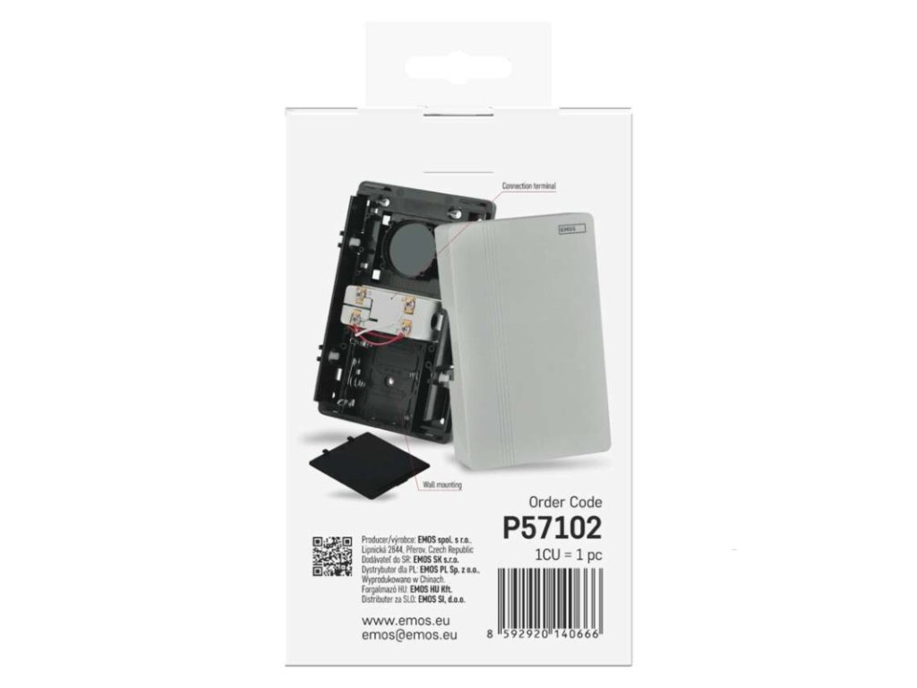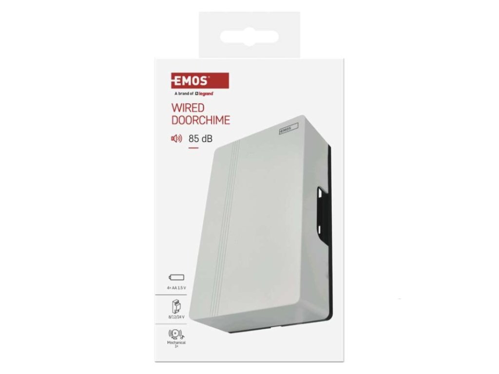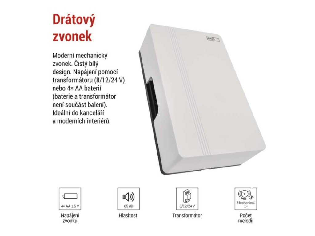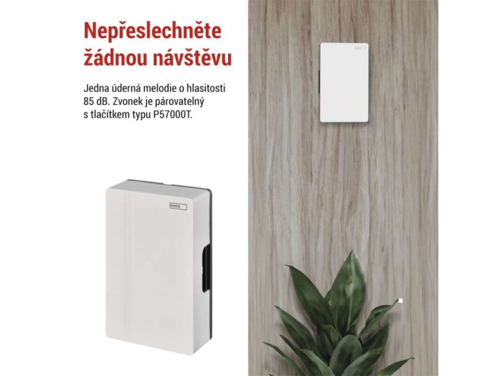 barva: bílá|další funkce: –|dosah tlačítka: drátové spojení|hlasová komunikace: ne|instalační materiál: –|jazyky aplikace: –|kompatibilita: –|maximální hlasitost zvonění: 85 dB|možnost přidat další tlačítko: ne|napájení hlavní jednotky: 4× 1,5 V AA/transformátor (nejsou součástí balení)|napájení tlačítka: drátové spojení|notifikace do mobilní aplikace: ne|optická signalizace na tlačítku: ne|optická signalizace na zvonku: ne|ovládání hlasovými asistenty: ne|počet melodií: 1|počet přijímačů v balení: 1 ks|počet tlačítek v balení: není v balení|podporované OS: –|přenosová frekvence: drátové spojení|přídavné (náhradní) tlačítko: P57000T|prodejní obal: 1 ks, krabička|protokol: –|řada: –|regulace hlasitosti: ne|rozměr tlačítka: –|rozměr zvonku: 170 × 105 × 49 mm|speciální funkce: ne|voděodolné tlačítko: –|způsob párování: není|způsob přenosu: drátový zvonekDoplňkové parametry