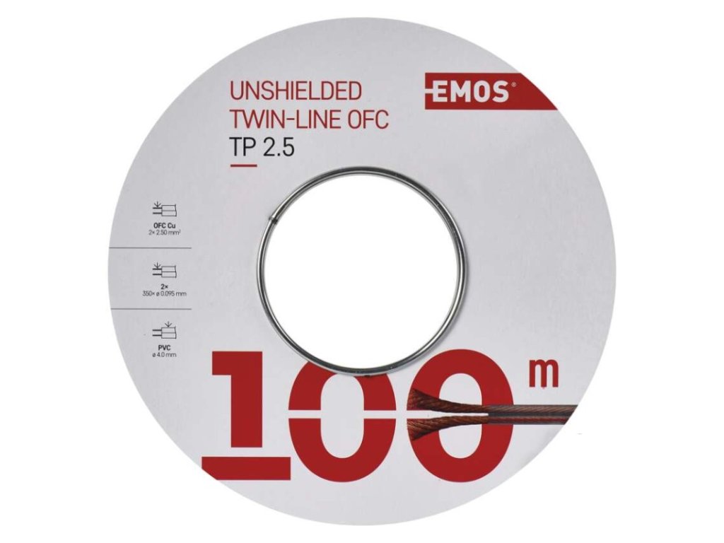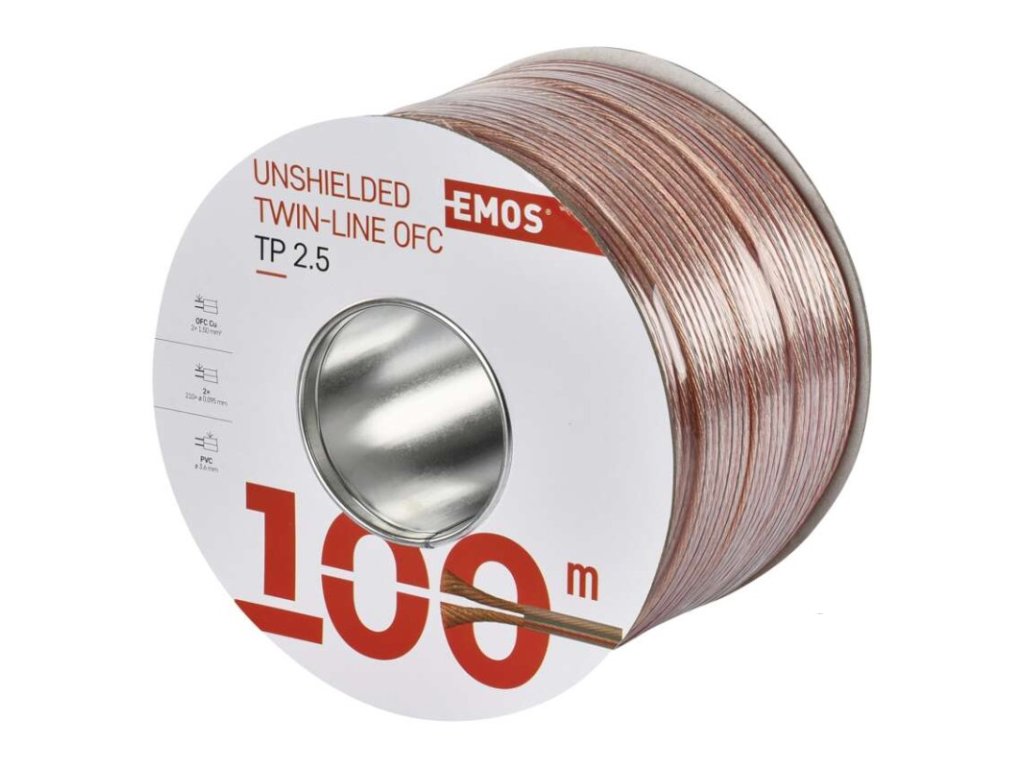 barva izolace vnitřních vodičů: není|barva pláště: průhledná, průhledná|dvojitá izolace: ne|materiál pláště: PVC|materiál vnitřního vodiče: OFC měď (Cu)|materiál vodičů stínění: není|maximální provozní napětí: 50 V|počet drátků stínění: není|předpokládané použití: propojení reproduktorů|prodejní obal: 100 m, cívka|průměr vnitřního vodiče: 350× 0,095 mm|průřez drátků stínění: není|průřez vodiče: 2,5 mm²|stínění: ne|typové označení: SP250/TP|vnější izolace: 2× 4,3 mm|záruční doba: 5 let|způsob balení - délka: 100 mDoplňkové parametry