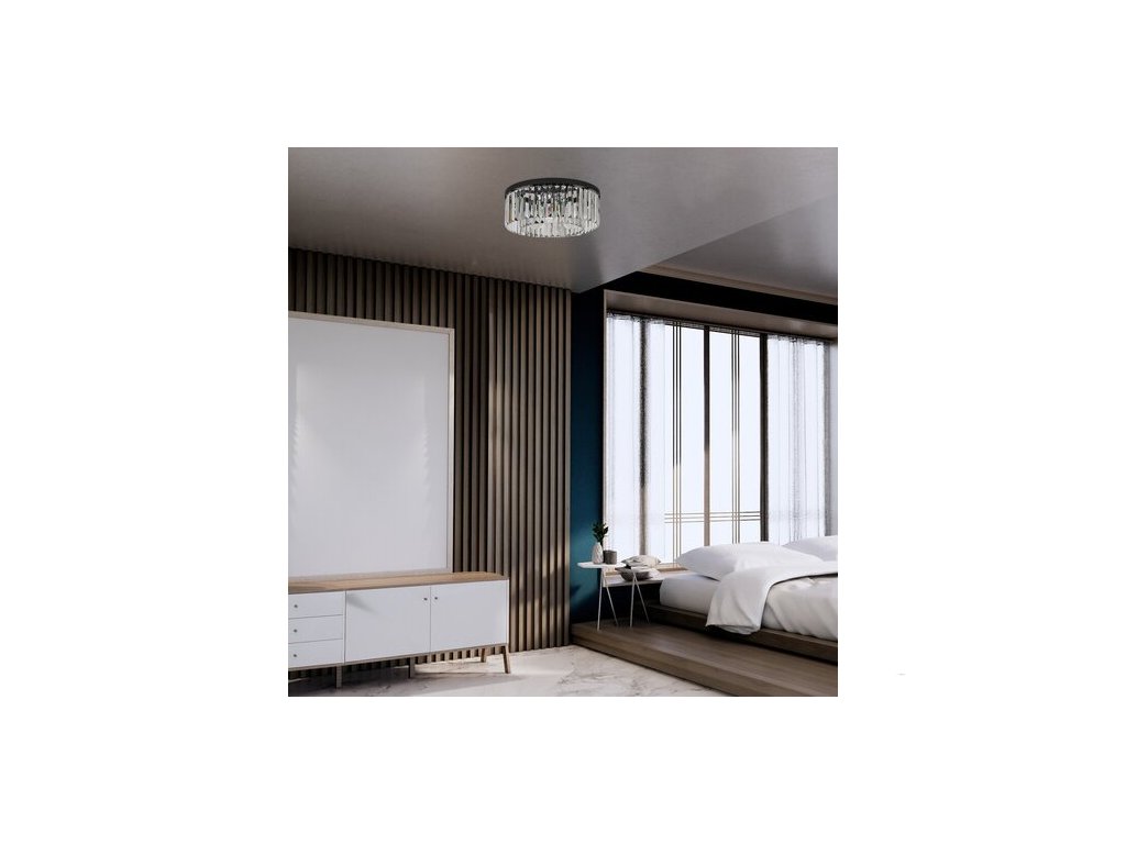 Elegantní stropní svítidlo Eloisa v klasickém stylu může být ozdobou vašeho obývacího pokoje nebo ložnice. Doporučujeme jej především těm, kteří mají rádi lesklé, poutavé modely. Černá kovová svítilna doplňují průhledné skleněné závěsy, které zakrývají světelný zdroj jako kruhový závěs a dodávají tomuto modelu vzhled lustru. Eloise lze připevnit na strop pomocí kulatého černého ozdobného podstavce. Lampu lze používat se třemi světelnými zdroji každý s maximálním příkonem do 25 W a s paticemi typu E27. Pokud je tento zářivý model namontujete v ložnici, doporučujeme použít zdroj teplého bílého světla, který pomůže vytvořit útulnou domácí atmosféru, uvolnit oči a pomůže vám uvolnit se před usínáním. Rozměry stropního svítidla Eloise jsou tyto: průměr 400 mm, vzdálenost od stropu 185 mm, instalační průměr 200 mm. Tento model se dodává bez světelných zdrojů.