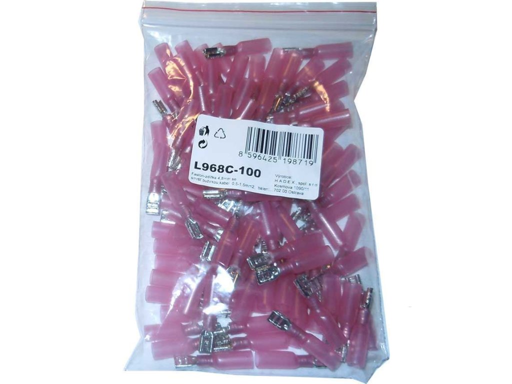 Faston-zdířka 4,8mm se smršť.bužírkou,kabel 0,5-1,5mm2, balení 100ksDoplňkové parametry