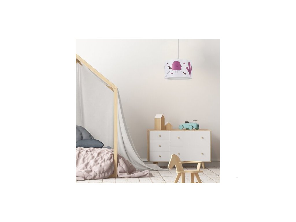 Dětské závěsné svítidlo Rabalux Fowly je vlastním designovým modelem značky Rabalux. Je ideální pro ty, kteří chtějí dětský pokoj zpříjemnit roztomilými a veselými motivy. Závěsné svítidlo je vyrobeno v bílé barvě s plastovou konstrukcí a látkovým stínidlem. Stínidlo je válcovité, otevřené ve spodní části a zdobené půvabným fialovým stylizovaným motivem ptáčka. Svítidlo lze připevnit ke stropu pomocí malé válcové dekorativní základny. Lze jej použít s jednou žárovkou o výkonu až 40 W. Typ objímky je E27. Pokud chcete vytvořit útulnou a intimní atmosféru, zvolte žárovku s teplým bílým světlem. Dětské závěsné svítidlo se dodává bez světelného zdroje.