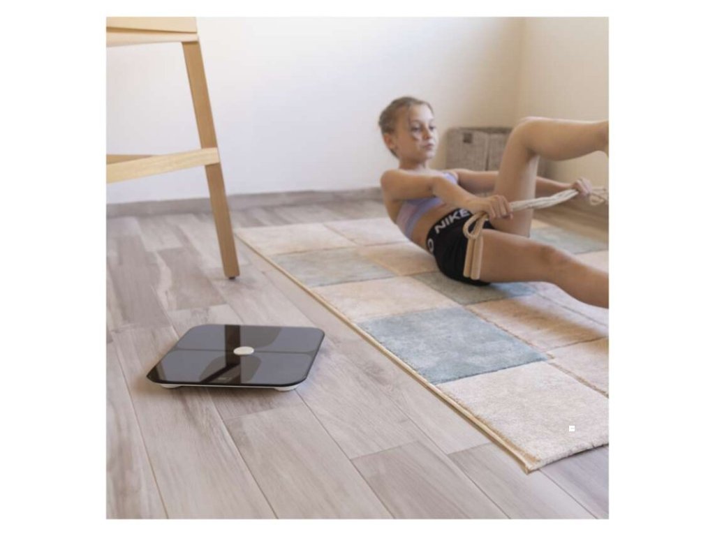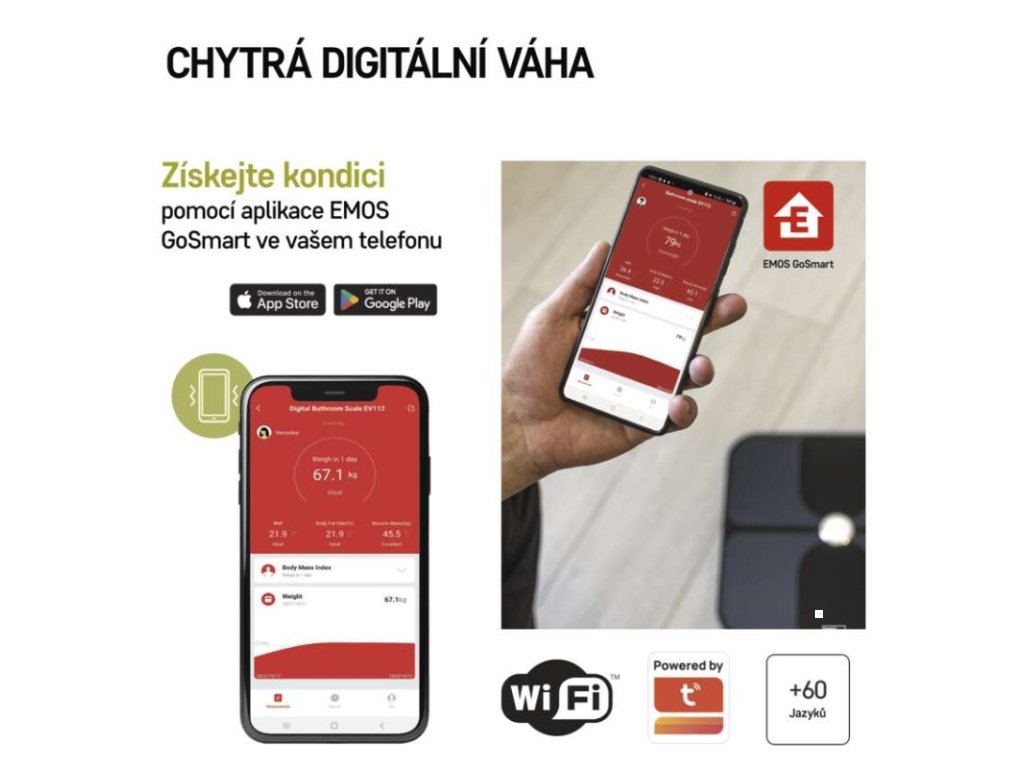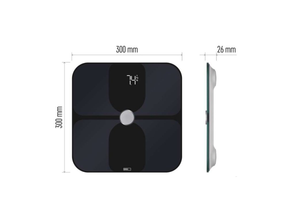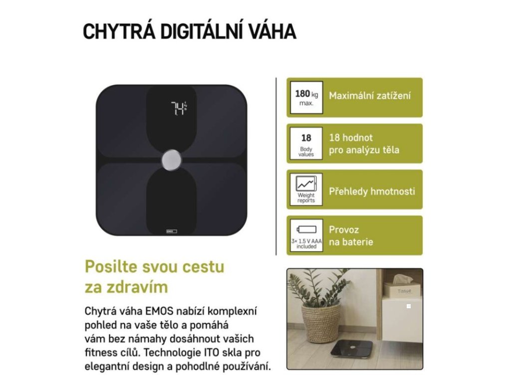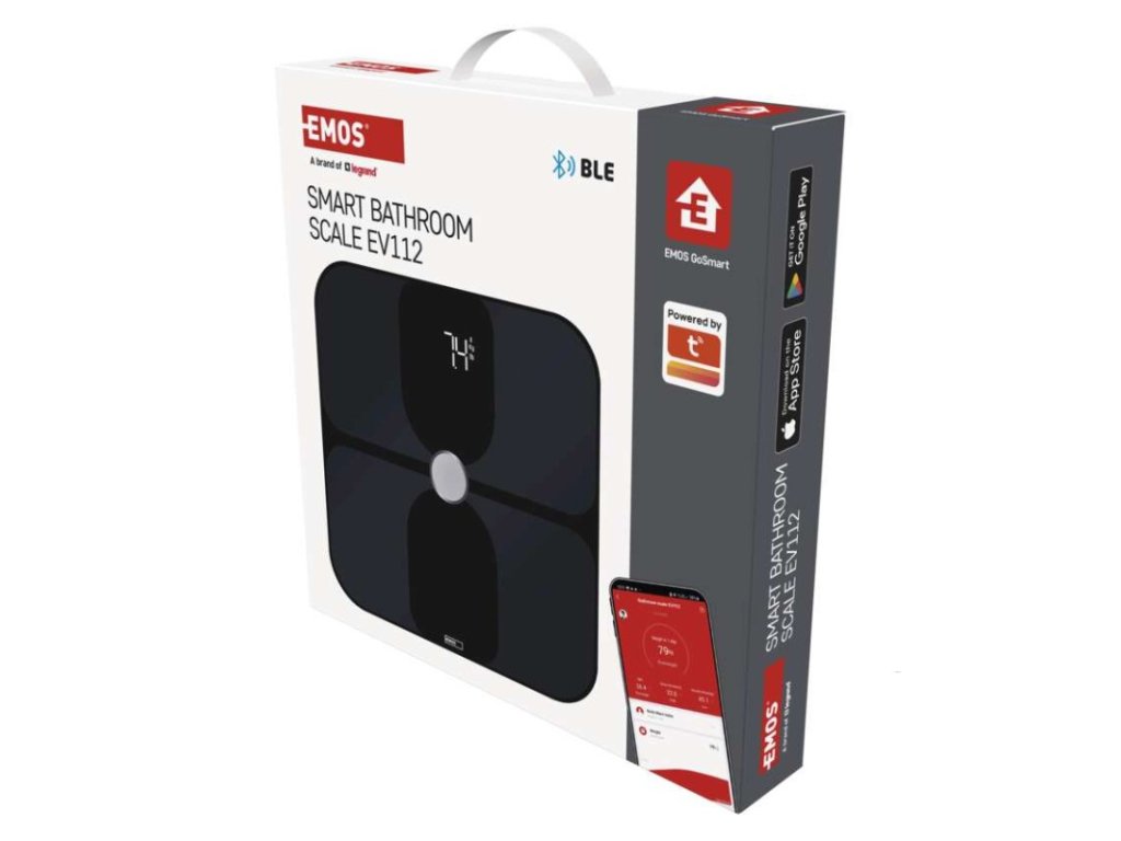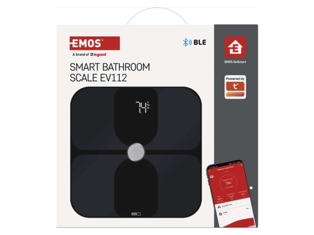 automatické vypnutí: ano|barva: černá|Bluetooth: ano|BMI index – měření tuku, vody a svalové hmoty: ano|další funkce: –|funkce dovažování: ne|indikace slabých baterií: ano|indikátor přetížení: ano|jazyky aplikace: EN, CZ, SK, PL, DE, HU, SI, FR, + 60 dalších jazyků|jednotky váhy: kg, lb|kompatibilita: EMOS GoSmart, TUYA, LIDL, Smartlife, Otevřený systém|LCD displej: ano|max. zátěž: 180 kg|napájení: 3× 1,5 V AAA (součástí balení)|notifikace do mobilní aplikace: ano|ovládání hlasovými asistenty: ne|paměť: max. 10 osob|podporované OS: Android, iOS|podsvícený displej: ano|povrch váhy: ITO tvrzené sklo|přenosová frekvence: 2,4 GHz|přesnost vážení: 100 g|prodejní obal: 1 ks, krabice|produkt: osobní váha|protokol: Bluetooth 5.0|rozměr: 26 × 300 × 300 mmDoplňkové parametry