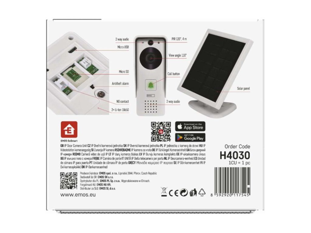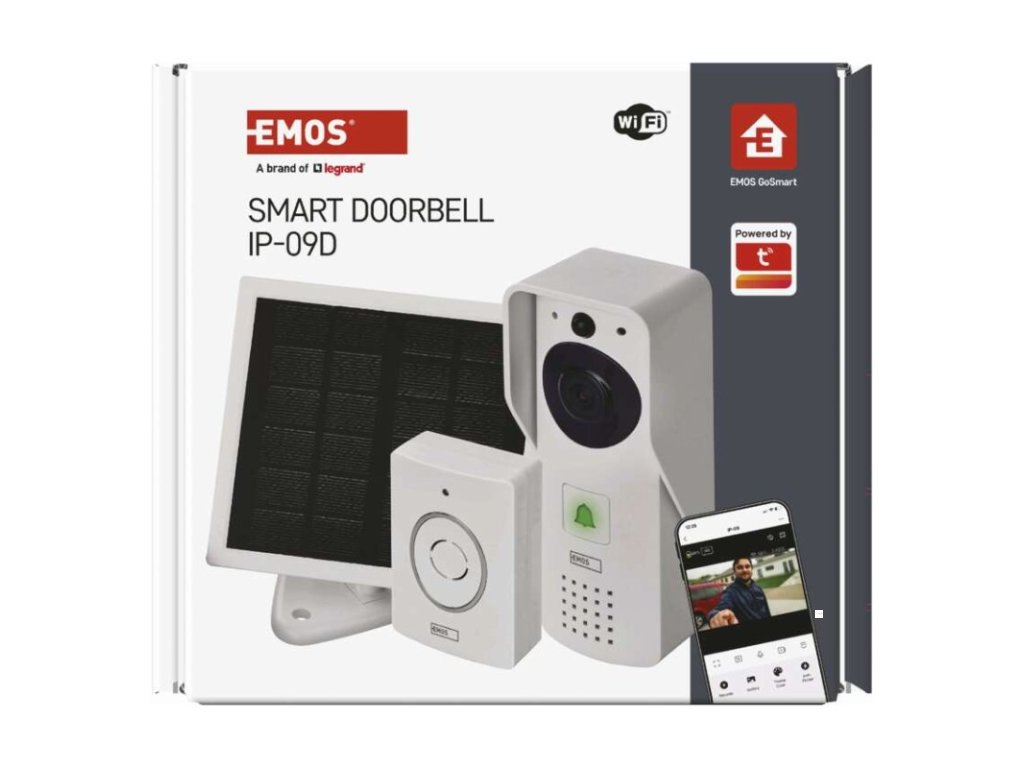 antivandal provedení kamerové jednotky: ne|automatické ukládání snímků: ano|barva: bílá|další funkce: –|detekce pohybu: ano|doporučená kabeláž: bez kabeláže|Funkce WebRTC: ano|hlasová komunikace: obousměrná|IR CUT: ano|jazyky aplikace: EN, CZ, SK, PL, DE, HU, SI, FR, + 60 dalších jazyků|kompatibilita: EMOS GoSmart, TUYA, LIDL, Smartlife, Otevřený systém|krytí kamerové jednotky: IP44|maximální dosvit nočního vidění: 1 metr|maximální úhel záběru kamery: 110°|montáž: na stěnu|možnost připojení přídavných kamer: ne|napájení kamerové jednotky: 2×18650 baterie 2 200 mAh + solární panel + Adaptér DC 5 V/1 A (součást balení)|napájení vnitřního zvonku: 3× AA (LR6) 1,5 V DC (není součástí balení)|noční vidění: ano|notifikace do mobilní aplikace: ano|obsah balení: 1× dveřní kamerová jednotka, 2× baterie Li-Ion 18650, 1× dešťová clona, 1× solární panel, 1× propojovací kabel, 1× bezdrátový zvonek, 1× instalační materiál, 1× manuál|ochrana proti odcizení: ano|ovládání hlasovými asistenty: ano (Amazon Alexa, Google Assistant)|ovládání pojezdu brány: ne|ovládání zámků: ano|počet melodií vnitřního zvonku: 25|počet tlačítek kamerové jednotky: 1|podporované OS: Android, iOS|přenosová frekvence: 2,4 GHz WIFI|přídávný vnitřní zvonek: ano|prodejní obal: 1 ks, krabice|protokol: Wi-Fi|regulace hlasitosti: ano|rozlišení kamery: 1 920 × 1 080|rozměr kamerové jednotky: 149 × 63 × 46 mm|siréna: ano|snímací prvek kamery: 2,69 mm JX-F37|typ produktu: videozvonek|ukládání na cloud: ano|ukládání na SD kartu: ano|záruční doba: 2 roky|zdroj součástí balení: anoDoplňkové parametry
