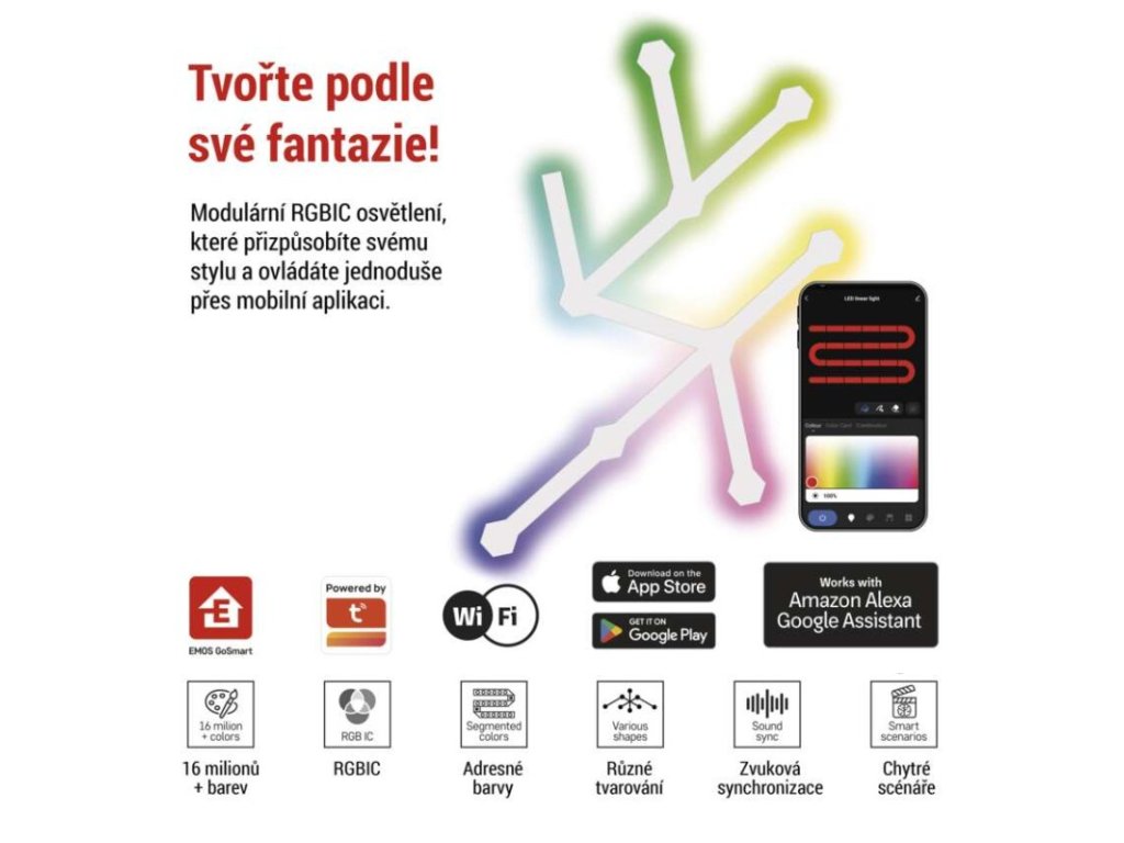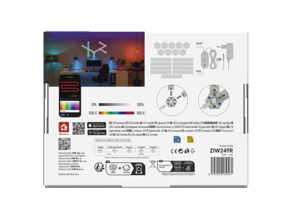 barva světla: RGBIC|barva těla: bílá|délka: –|délka přívodu: 1,5 m|energetická třída obsaženého světelného zdroje: –|jazyky aplikace: EN, CZ, SK, PL, DE, HU, SI, FR, + 60 dalších jazyků|kategorie: –|kompatibilita: EMOS GoSmart, Tuya, Lidl, Smartlife|krytí: IP20|materiál difuzoru: plast|materiál těla: plast|maximální počet segmentů: 18|nastavení barev (RGB): ano|nastavení teploty chromatičnosti: ne|notifikace do mobilní aplikace: ano|obsažený světelný zdroj: –|ovládání hlasovými asistenty: ano (Amazon Alexa, Google Assistant)|počet segmentů: 18|počet spínacích cyklů: –|podporované OS: iOS, Android|přenosová frekvence: 2,4 GHz (IEEE 802.11b/g/n)|příkon: 34 W|prodejní obal: 1 ks, krabička|protokol: WIFI + BLE|řada: GoSmart|RGB digital: ano|šířka: –|stmívání: ano|světelná účinnost: –|světelný tok: –|technologie: LED|teplota chromatičnosti: –|tvar: –|vstupní napětí: 220–240 V~/50 Hz|výška: –|záruční doba: 2 roky|životnost: 20 000 hodinDoplňkové parametry