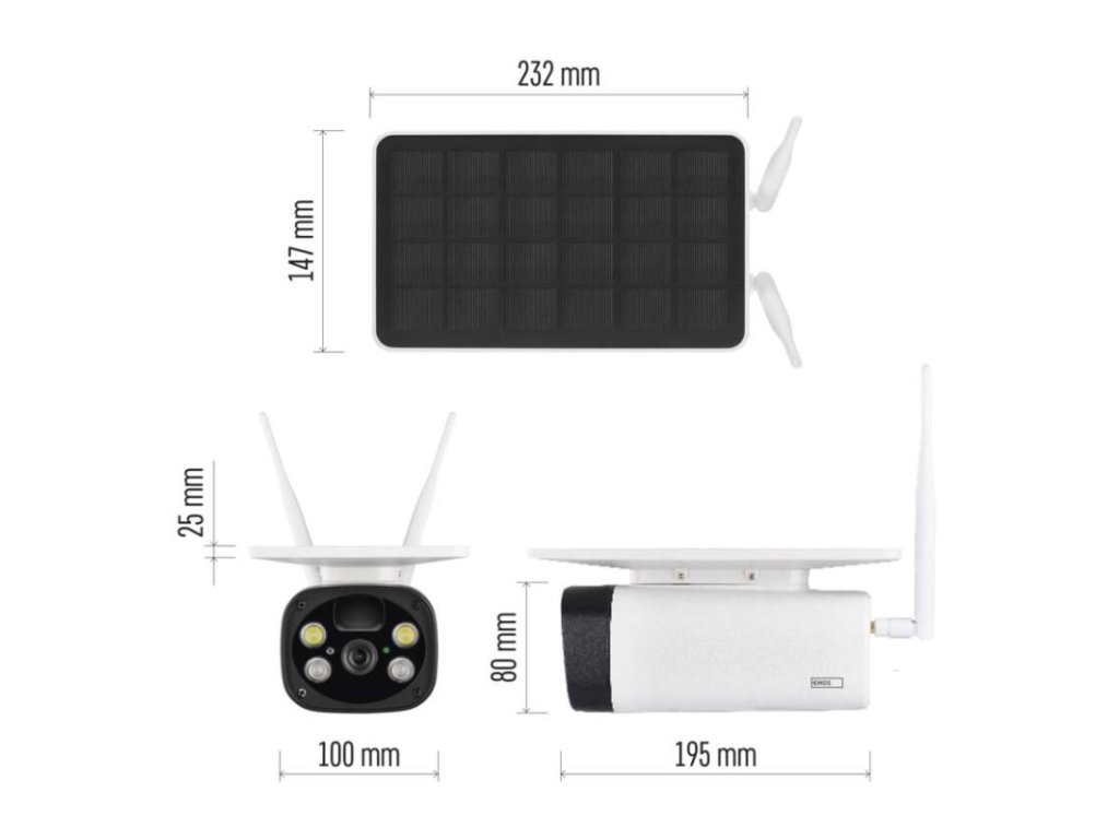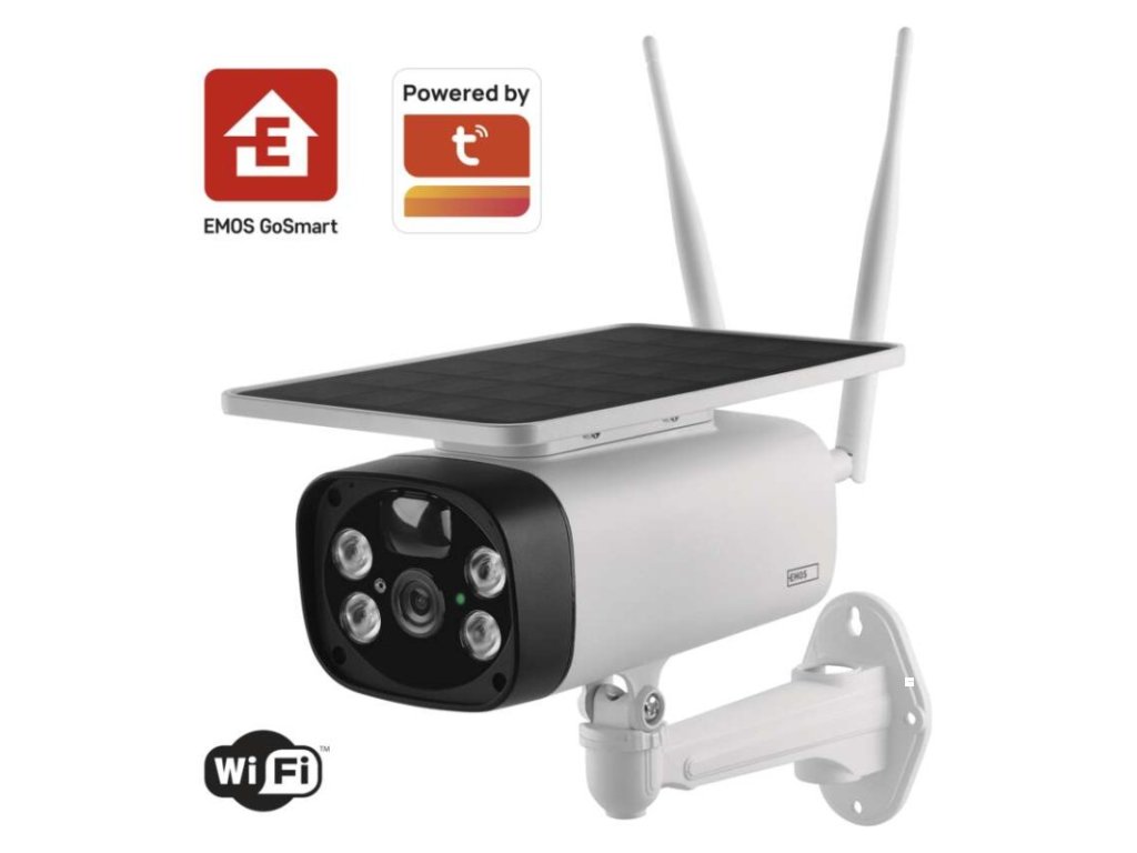 automatické ukládání snímků: ano|barva: bílá|další funkce: –|detekce pohybu: ano|detekce zvuku: ne|dosah detekce pohybu: 10 metrů|funkce WebRTC: ano|hlasová komunikace: obousměrná|hloubka: 235 mm|instalační materiál: ano|IR CUT: ano|jazyky aplikace: EN, CZ, SK, PL, DE, HU, SI, FR, + 60 dalších jazyků|kompatibilita: EMOS GoSmart, TUYA, LIDL, Smartlife, Otevřený systém|krytí: IP55|maximální dosvit nočního vidění: 10 metrů|maximální úhel záběru kamery: 110°|montáž: na stěnu|motorizované otáčení: ne|napájení kamery: 4×18650 baterie 2 200 mAh + solární panel + Adaptér DC 5 V/1 A (součást balení)|nastavení oblasti detekce: ne|noční vidění: ano|notifikace do mobilní aplikace: ano|obsah balení: 1× kamerová jednotka, 4× baterie Li-Ion 18650, 1× držák, 1× USB-C kabel, 1× instalační materiál, 1× manuál|ochrana proti odcizení: blokováno aplikací|ovládání hlasovými asistenty: ano|podpora ONVIF: ne|podporované OS: Android, iOS|přenosová frekvence: 2,4 GHz WIFI|přídavné LED světlo: ne|přídavný vnitřní monitor: ne|prodejní obal: 1 ks, krabice|protokol: Wi-Fi|řada: GoSmart|rozlišení kamery: 1 920 × 1 080|rozpoznání lidského těla: ano|rozpoznání zvířete: ne|siréna: ano|šířka: 140 mm|sledování pohybu (tracking): ne|snímací prvek kamery: –|soukromý (privátní) mód: ne|typ držáku: stativový závit|typ produktu: IP kamera|úhel detekce pohybu: 120°|ukládání na cloud: ano|ukládání na SD kartu: ano|výdrž baterie: až 8 měsíců|výška: 100 mm|vyvolání hovoru tlačítkem: ne|záruční doba: 2 roky|zdroj součástí balení: anoDoplňkové parametry