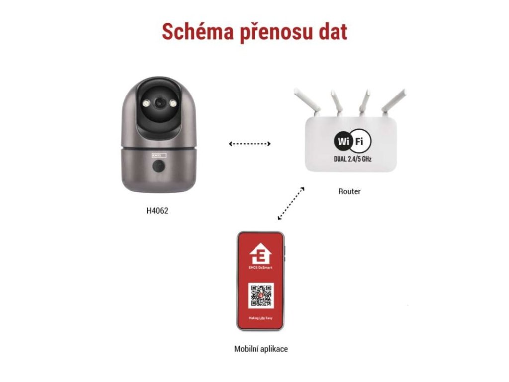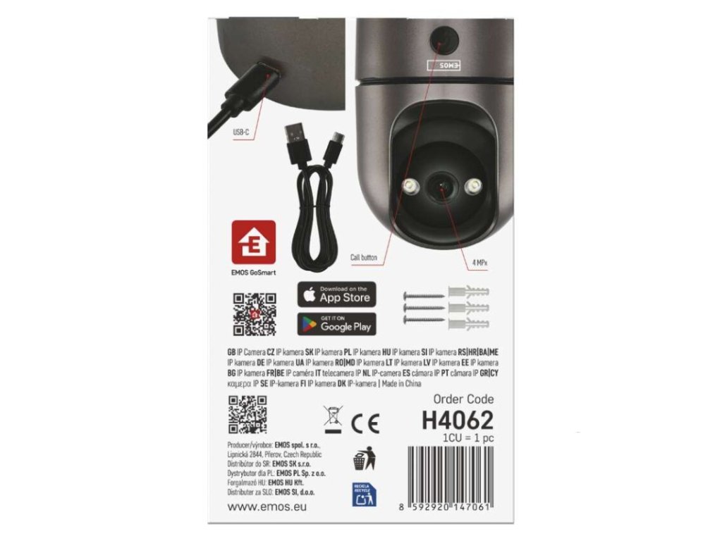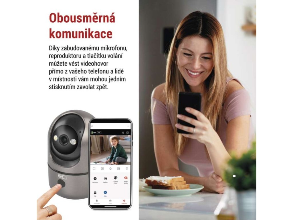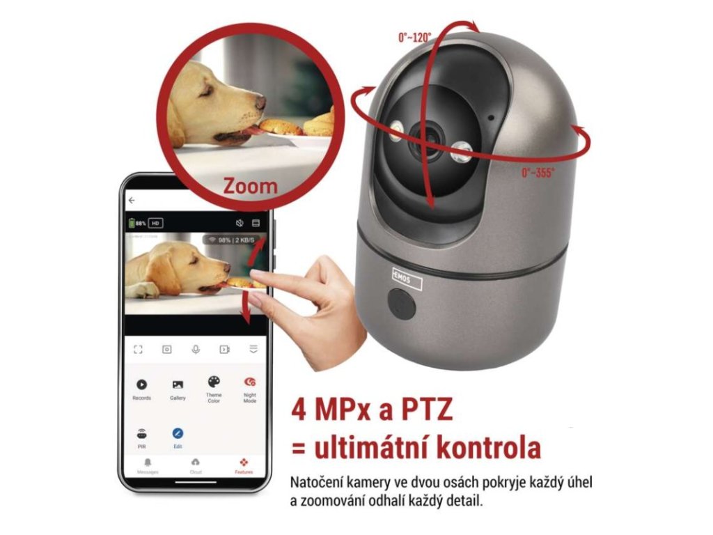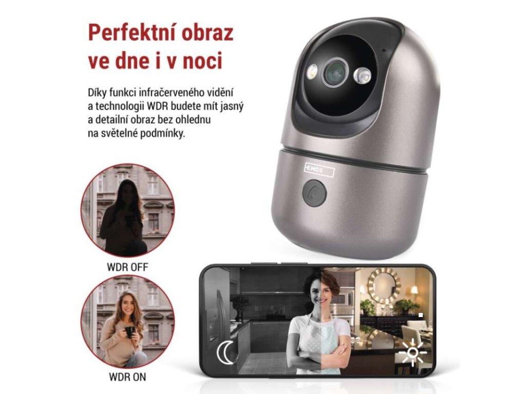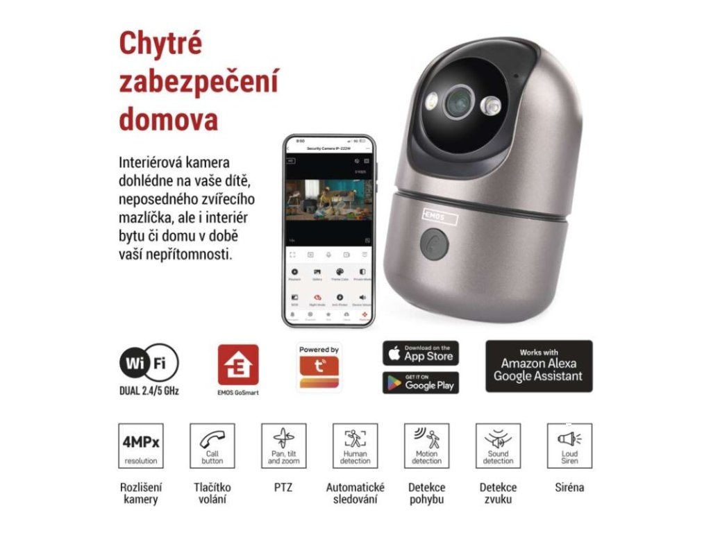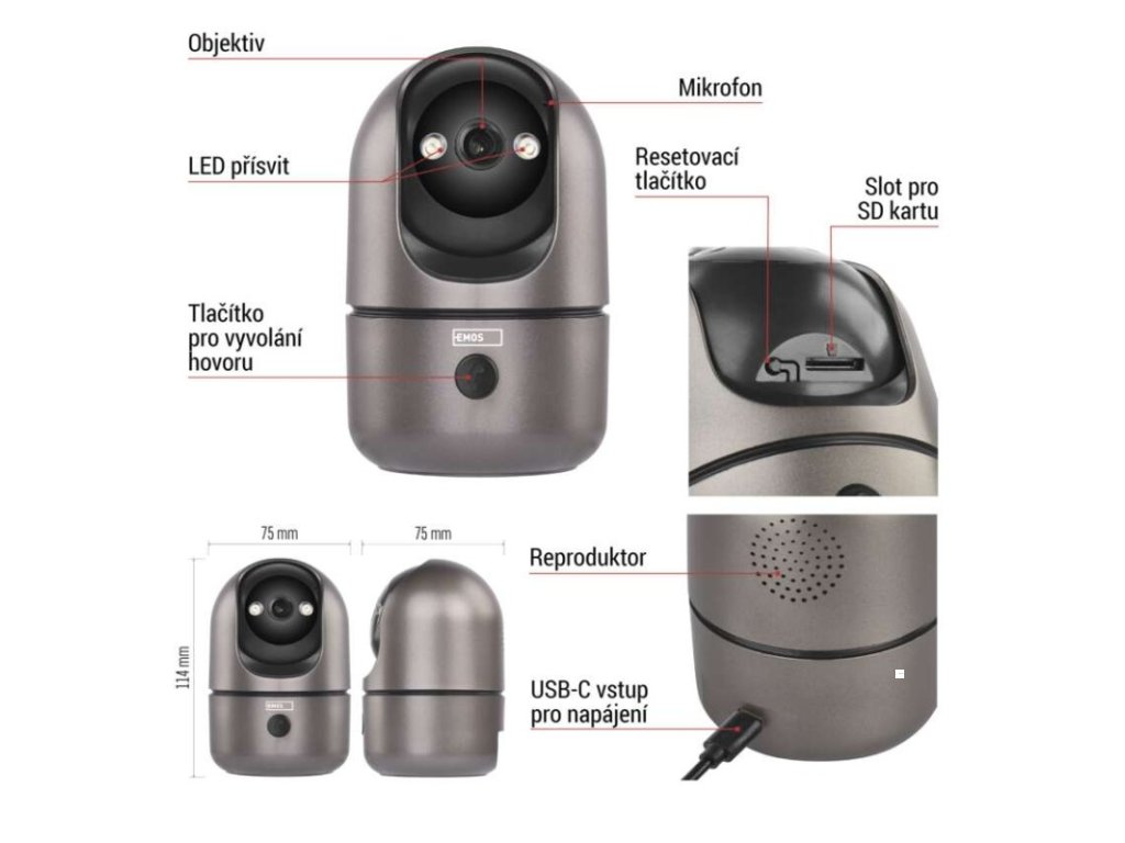 automatické ukládání snímků: ano|barva: gunmetal šedá, černá|další funkce: –|detekce pohybu: ano|detekce zvuku: ano|dosah detekce pohybu: 10 metrů|funkce WebRTC: ano|hlasová komunikace: obousměrná|hloubka: 75 mm|instalační materiál: ano|IR CUT: ano|jazyky aplikace: EN, CZ, SK, PL, DE, HU, SI, FR, + 60 dalších jazyků|kompatibilita: EMOS GoSmart, TUYA, LIDL, Smartlife, Otevřený systém|krytí: IP21|maximální dosvit nočního vidění: 10 metrů|maximální úhel záběru kamery: 180°|montáž: na stěnu + na postavení|motorizované otáčení: ano|napájení kamery: DC 5 V/1 A (součást balení)|nastavení oblasti detekce: ano|noční vidění: ano|notifikace do mobilní aplikace: ano|obsah balení: 1× kamera, 1× manuál|ochrana proti odcizení: blokováno aplikací|ovládání hlasovými asistenty: ano (Amazon Alexa, Google Assistant)|podpora ONVIF: ano|podporované OS: Android, iOS|přenosová frekvence: 2,4 GHz/5 GHz Dual Band|přídavné LED světlo: ano|přídavný vnitřní monitor: ano|prodejní obal: 1 ks, krabice|protokol: Wi-Fi|řada: GoSmart|rozlišení kamery: 2 560 × 1 440|rozpoznání lidského těla: ano|rozpoznání zvířete: ne|siréna: ano|šířka: 75 mm|sledování pohybu (tracking): ano|snímací prvek kamery: 1/3.0'' 4Megapixel CMOS|soukromý (privátní) mód: ano|typ držáku: základní|typ produktu: IP kamera|úhel detekce pohybu: 120°|ukládání na cloud: ano|ukládání na SD kartu: ano|výdrž baterie: –|výška: 114 mm|vyvolání hovoru tlačítkem: ano|záruční doba: 3 roky|zdroj součástí balení: neDoplňkové parametry