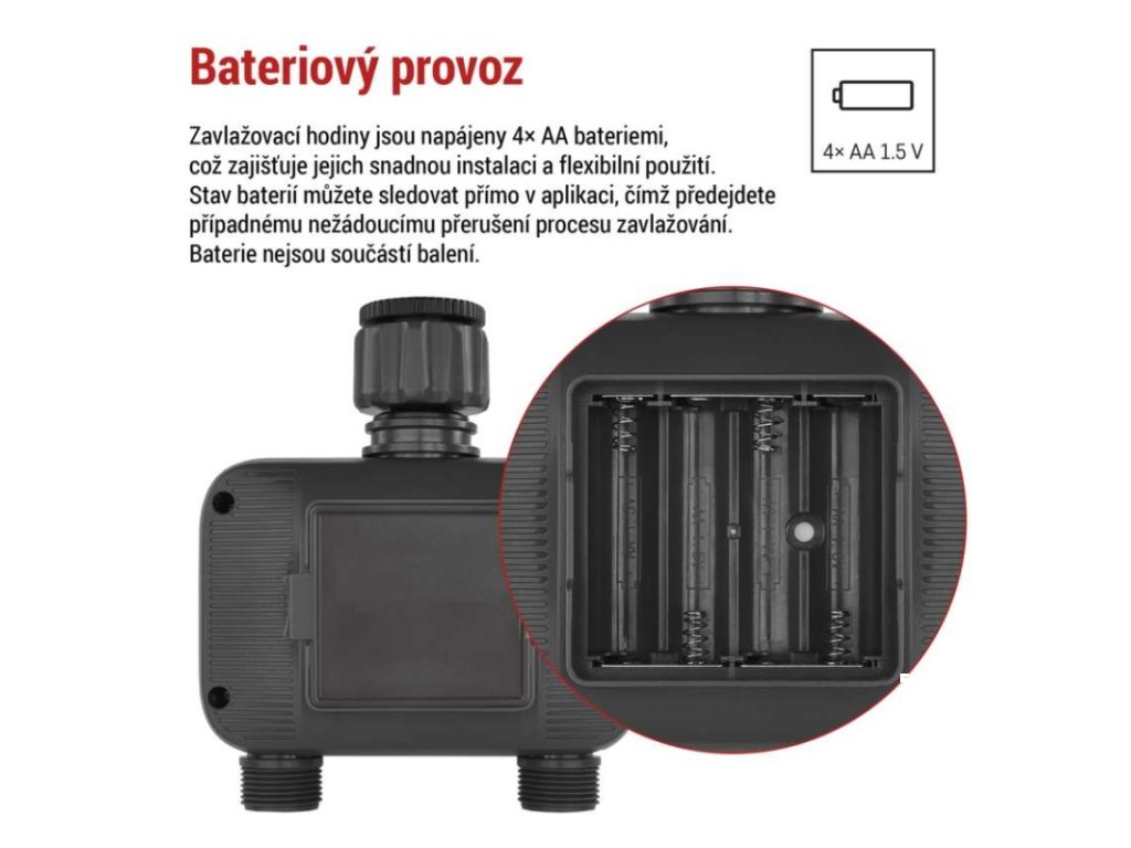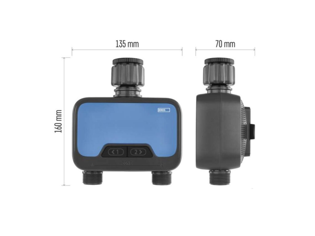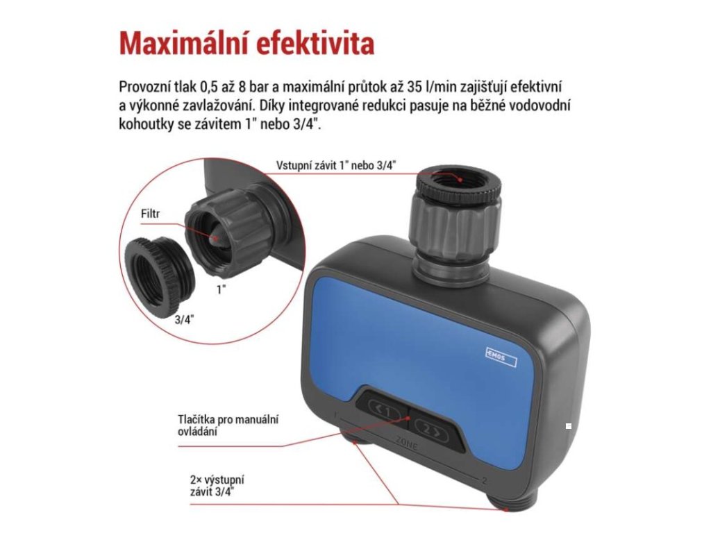 další funkce: –|délka zavlažování: 1 minuta – 24 hodin|energetická třída: –|frekvence zavlažování: bez limitu|jazyky aplikace: EN, CZ, SK, PL, DE, HU, SI, FR, + 60 dalších jazyků|kompatibilita: EMOS GoSmart, TUYA, LIDL, Smartlife, Otevřený systém|krytí: IP54|manuální zavlažování: ano|maximální průtok: 35 l/min|napájení: 4× 1,5 V AA (nejsou součástí balení)|notifikace do mobilní aplikace: ano|ovládání hlasovými asistenty: ano (Amazon Alexa, Google Assistant)|podporované OS: Android, iOS|prodejní obal: 1 ks, krabička|protokol: Bluetooth 5.0|provozní tlak vody: 0,5–8 bar|řada: GoSmart|rozměr: 135 × 160 × 70 mm|záruční doba: 2 roky|závit: 3/4", 1"|zavlažovací cykly za den: bez limituDoplňkové parametry