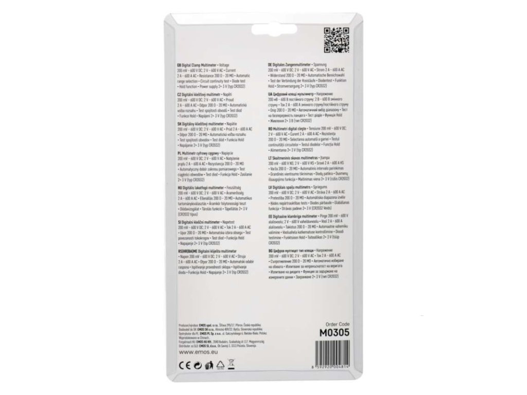 AC napětí: 2–600 V|AC proud: 2–600 A|automatické vypnutí: ano|bezkontaktní detekce AC napětí: ne|DC napětí: 200 mV – 600 V|DC proud: ne|elektrický odpor: 200 Ohm – 20 MOhm|indikace slabé baterie: ano|klešťový multimetr: ano|kontaktní detekce AC napětí: ne|měření teploty: ne|napájení: 2× 3 V CR2032 (součástí balení)|podsvícení displeje: ne|prodejní obal: 1 ks, blistr|rozměr: 36 × 76 × 190 mm|součást dodávky: baterie, návod, měřicí hroty|spojitost obvodů: ano|test baterií: ne|test diod: ano|test tranzistorů: ne|volba rozsahu: automatická|záznam max. hodnoty: ne|záznam naměřené hodnoty: ano|zobrazení displeje: 3,5 digitDoplňkové parametry
