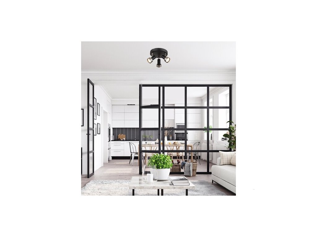 Trojité stropní bodové svítidlo Konrad v industriálním stylu se doporučuje především do obývacího pokoje nebo ložnice. Matný černý model, celý vyrobený z kovu, je doplněn stříbrnými stínítky a lze jej připevnit na strop pomocí velké kulaté ozdobné základny. Díky pohyblivým hlavám lampy můžete ovládat světlo lampy, jak chcete. Konrad lze použít se třemi světelnými zdroji, každý s výkonem do 50 W, objímka typu GU10. Dle našeho vkusu a místa instalace si můžeme zvolit světelné zdroje s teplým nebo přirozeným bílým světlem. Pokud chceme stropní svítidlo použít v ložnici, doporučujeme jej provozovat se zdroji teplého bílého světla, které napomáhají navození intimní, domácké atmosféry. Rozměry trojitého bodového svítidla Konrad: průměr 240 mm, vzdálenost od stropu 115 mm, montážní průměr 190 mm. Tento model je dodáván bez světelných zdrojů.