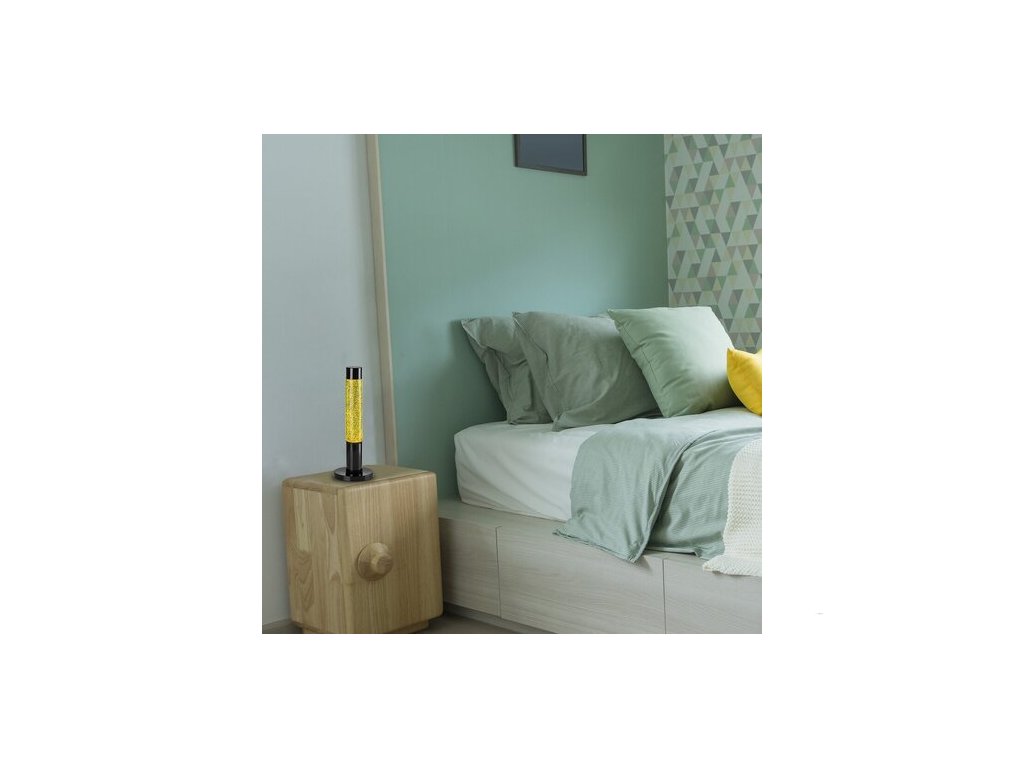 Dekorativní lampu Rabalux Lavastic doporučujeme všem, kteří hledají působivé osvětlení s jedinečnou atmosférou a slavnostním vzhledem. Vnitřní část lampy je naplněna zlatavě zbarvenou tekutinou s třpytivými částicemi slídy, což tomuto modelu dodává zářivý, slavnostní vzhled. Válcovitá konstrukce a dekorativní základna ve tvaru disku jsou vyrobeny z kovu v černé barvě, zatímco stínítko je z průhledného skla. Tato lávová lampa se ovládá vypínačem na kabelu a disponuje vestavěným LED světelným zdrojem, který zaručuje dlouhou životnost. Velkou předností této dekorativní lampy je možnost snadného přesunu mezi místnostmi, takže její magickou atmosféru si může kdykoliv užít každý člen rodiny. Je ideální volbou do obývacího pokoje, dětského pokoje nebo ložnice.