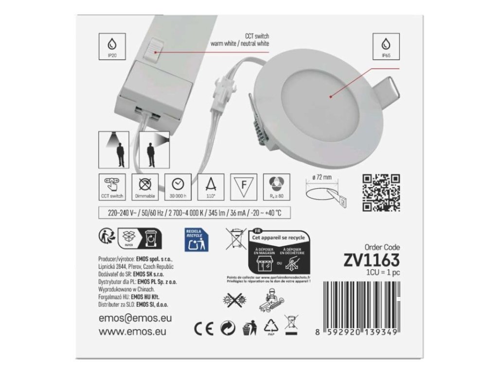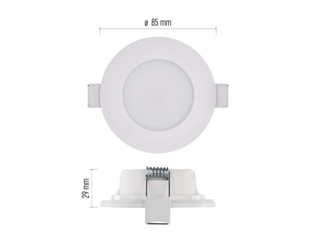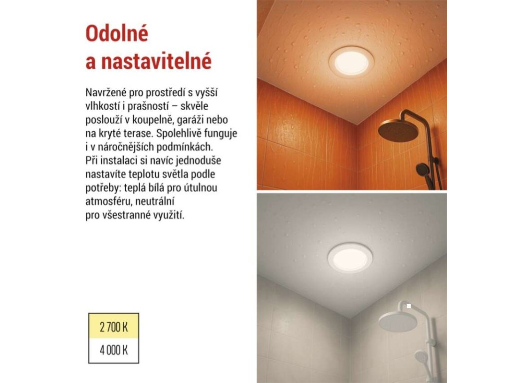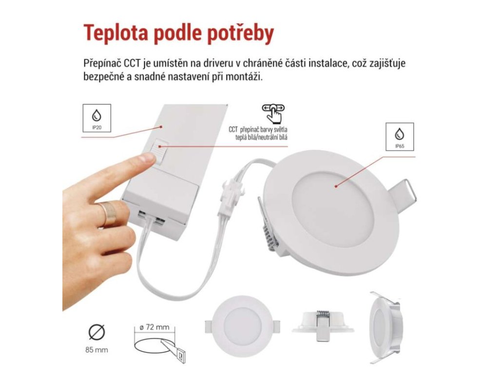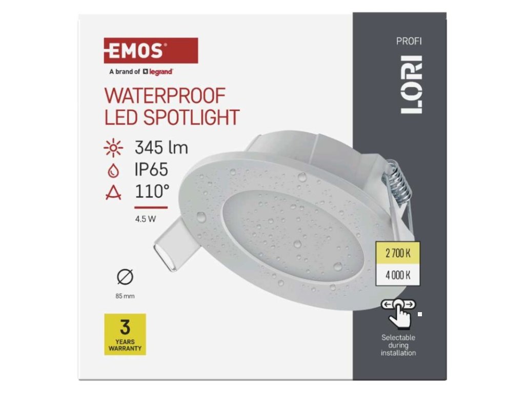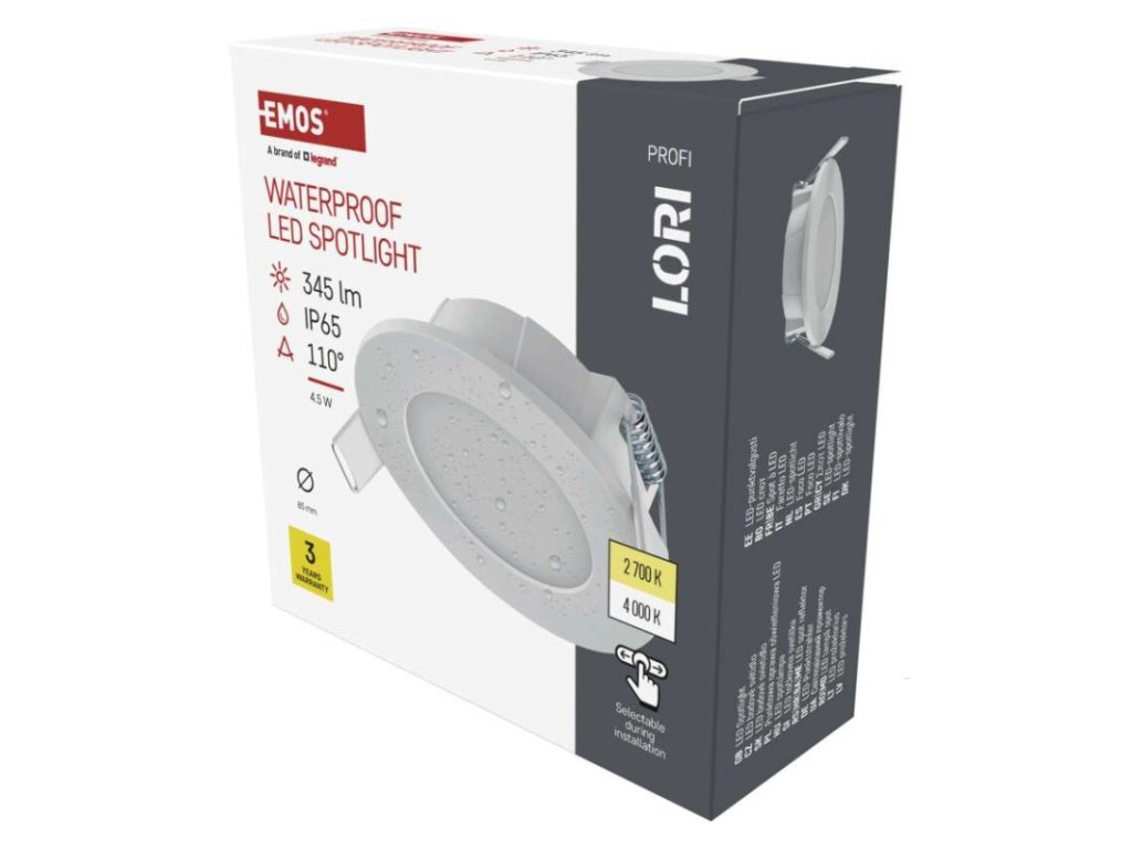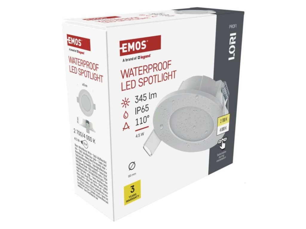 barva světla: teplá/neutrální bílá|barva těla: bílá|dálkový ovladač: ne|další funkce: –|do chodby a na schodiště: ano|do dílny a garáže: ne|do kanceláře: ano|do koupelny: ano|do kuchyně: ano|do obýváku, ložnice a dětského pokoje: ne|dosah senzoru: neuvádí se|flicker-free: ano|frekvence: 50/60 Hz|index podání barev (CRI): Ra > 80|jazyky aplikace: –|kategorie: PROFI|kompatibilita: –|krytí: IP65|materiál difuzoru: plast (PC)|materiál LGP: neuvádí se|materiál těla: plast|montážní otvor: 72 mm|možnost stmívání: ne|náhrada za žárovku: 30 W|napětí: 220–240 V~|na zahradu a balkon: ano|notifikace do mobilní aplikace: ne|obsah balení: –|ovládání hlasovými asistenty: ne|podporované OS: –|pohybový senzor: ne|přenosová frekvence: –|příkon: 4,5 W|prodejní obal: 1 ks, krabice|protokol: –|proud: 36 mA|řada: –|rozměr: průměr 85 × 29 mm|světelná účinnost: 77 lm/W|světelný tok: 345 lm|teplota chromatičnosti: 2 700/4 000 K|tvar: kruh|typ difuzoru: mléčný|typ svítidla: bodovka|účiník: > 0,5|UGR<: neuvádí se|úhel vyzařování: 110°|umístění: stropní|výstupní proud ze zdroje: neuvádí se|záruční doba: 3 roky|zdroj světla: LED|životnost: 30 000 hodin|způsob montáže: vestavnéDoplňkové parametry