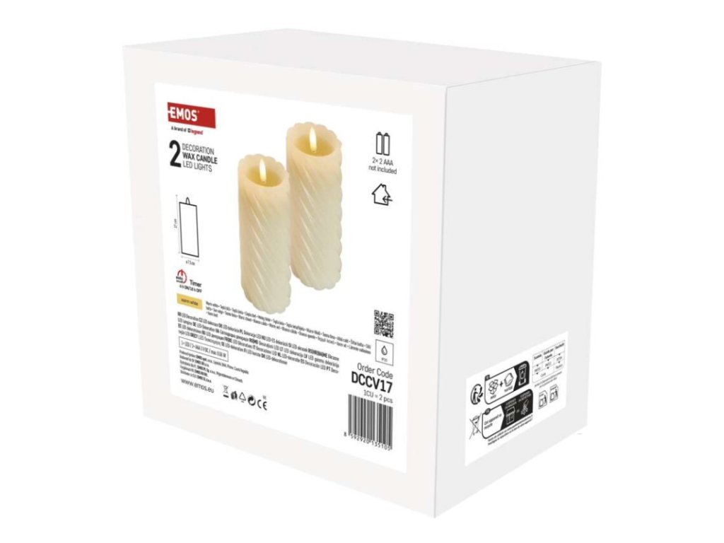 barva drátu: neuvádí se|barva světla: teplá bílá|časovač: ano|dálkový ovladač: ne|délka přívodu: neuvádí se|krytí: IP20|materiál: vosk|počet LED: 2× 1|použití: vnitřní|příkon: 0,06 W|prodejní obal: 2 ks, krabice|produkt: svíčka|rozměr: 7,5 × 7,5 × 17 cm|typ napájení: baterie 2× 2 AAA (není součástí balení)|vstupní napětí: neuvádí se|výstupní napětí: 3 V DC|záruční doba: 2 roky|zdroj svícení: LED|životnost: 10 000 hodinDoplňkové parametry