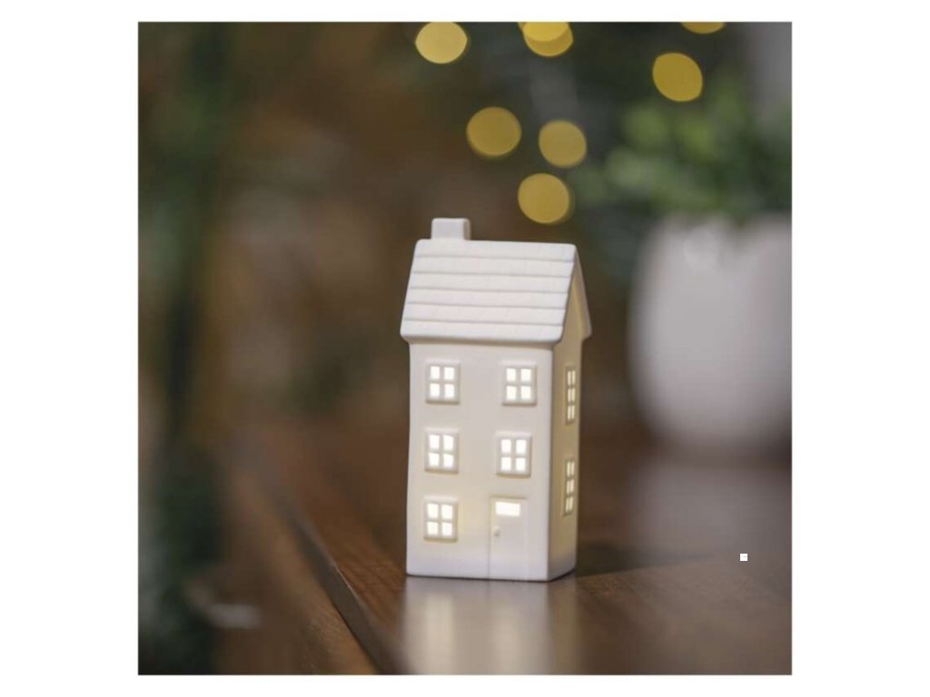 barva drátu: neuvádí se|barva světla: teplá bílá|časovač: ano|dálkový ovladač: ne|délka přívodu: neuvádí se|krytí: IP20|materiál: keramika|počet LED: 1|použití: vnitřní|příkon: 0,06 W|prodejní obal: 1 ks, krabice|produkt: domeček|rozměr: 77 × 60 × 163 mm|typ napájení: baterie 1× CR2032 (součástí balení)|vstupní napětí: neuvádí se|výstupní napětí: 3 V DC|záruční doba: 2 roky|zdroj svícení: LED|životnost: 10 000 hodinDoplňkové parametry