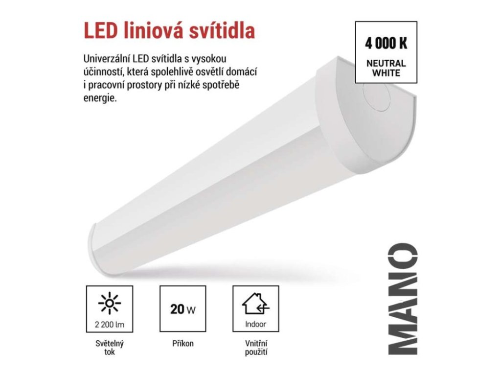 barva světla: neutrální bílá|barva těla: bílá|frekvence: 50/60 Hz|index podání barev (CRI): Ra >80|krytí: IP20|materiál: plast (PC)|materiál difuzoru: plast (PC)|materiál spon: nemá spony|materiál těla: plast (PC)|možnost stmívání: ne|náhrada za žárovku: neuvádí se|napětí: 220–240 V~|příkon: 20 W|prodejní obal: 1 ks, blistr|proud: 150 mA|průběžná montáž: neuvádí se|rozměr: 600 × 62 × 55 mm|rozsah pracovní teploty: -20 °C až +40 °C|stupeň ochrany proti mechanickým nárazům: IK06|světelný tok: 2 200 lm|světelný tok v nouzovém režimu: neuvádí se|teplota chromatičnosti: 4 000 K|třída ochrany: II|typ difuzoru: mléčný|typ montáže: přisazená|typ řízení: neuvádí se|úhel vyzařování: 120°|výdrž baterie: neuvádí se|záruční doba: 2 roky|záruka na baterii: neuvádí se|zdroj světla: LED|životnost: 25 000 hodinDoplňkové parametry