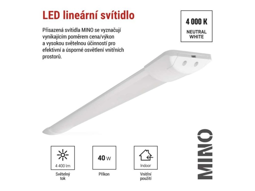 barva světla: neutrální bílá|barva těla: bílá|frekvence: 50/60 Hz|index podání barev (CRI): Ra >80|krytí: IP20|materiál: plast (PC)|materiál difuzoru: plast (PC)|materiál spon: nemá spony|materiál těla: plast (PC)|možnost stmívání: ne|náhrada za žárovku: neuvádí se|napětí: 220–240 V~|příkon: 40 W|prodejní obal: 1 ks, krabice|proud: 180 mA|průběžná montáž: neuvádí se|rozměr: 1 200 × 75,5 × 24,5 mm|rozsah pracovní teploty: -20 °C až +40 °C|stupeň ochrany proti mechanickým nárazům: IK06|světelný tok: 4 400 lm|světelný tok v nouzovém režimu: neuvádí se|teplota chromatičnosti: 4 000 K|třída ochrany: II|typ difuzoru: mléčný|typ montáže: přisazená|typ řízení: neuvádí se|úhel vyzařování: 120°|výdrž baterie: neuvádí se|záruční doba: 2 roky|záruka na baterii: neuvádí se|zdroj světla: LED|životnost: 25 000 hodinDoplňkové parametry