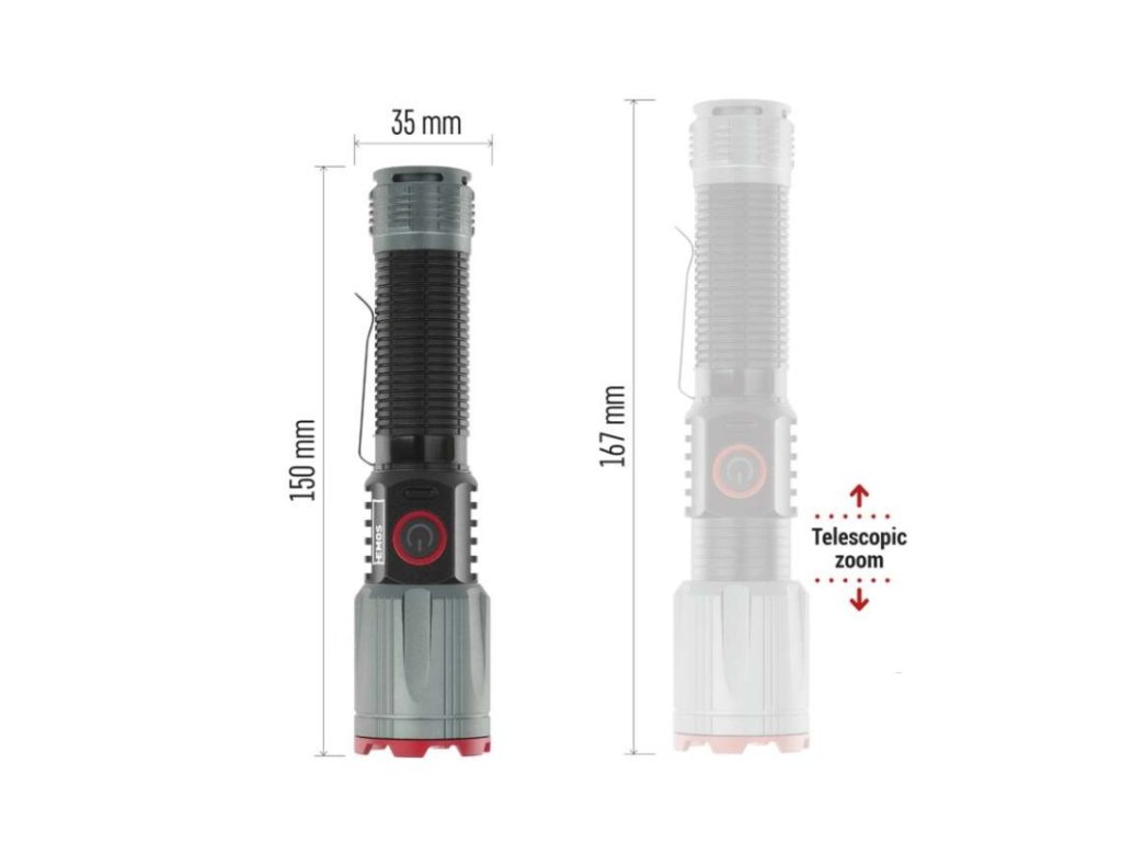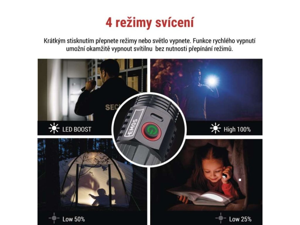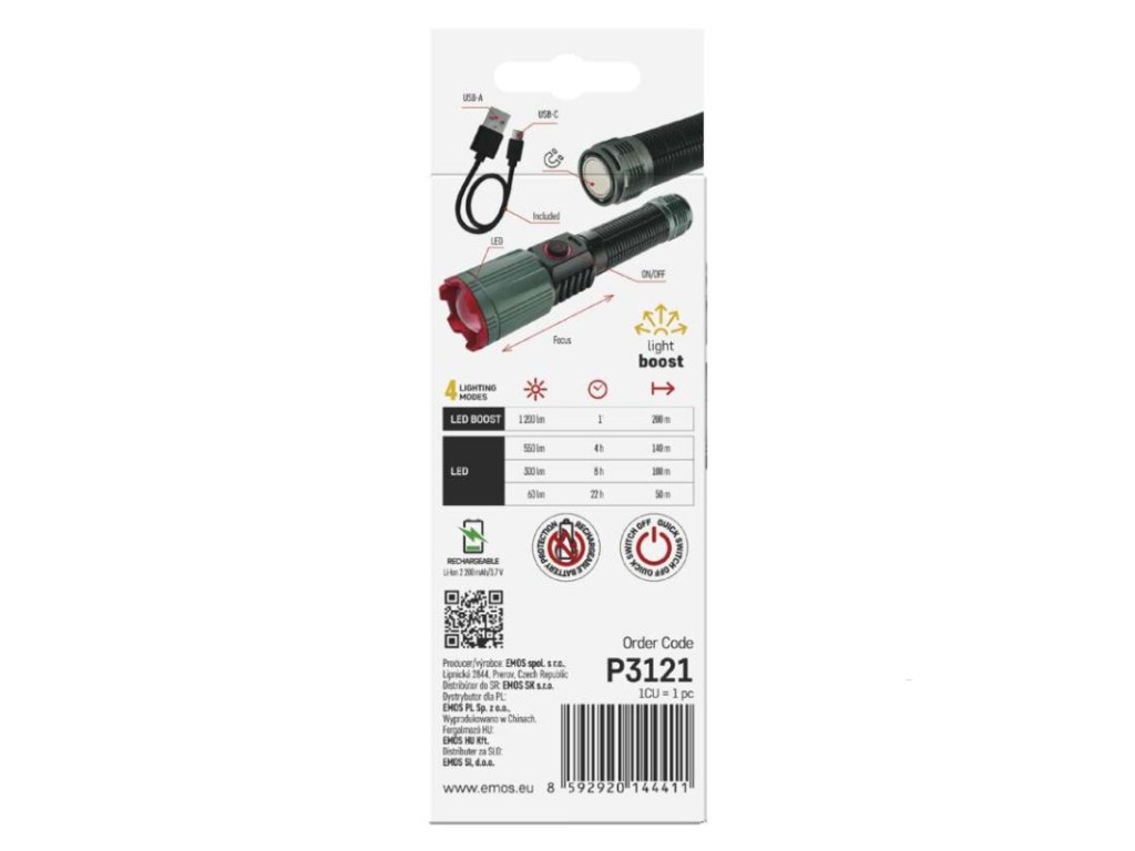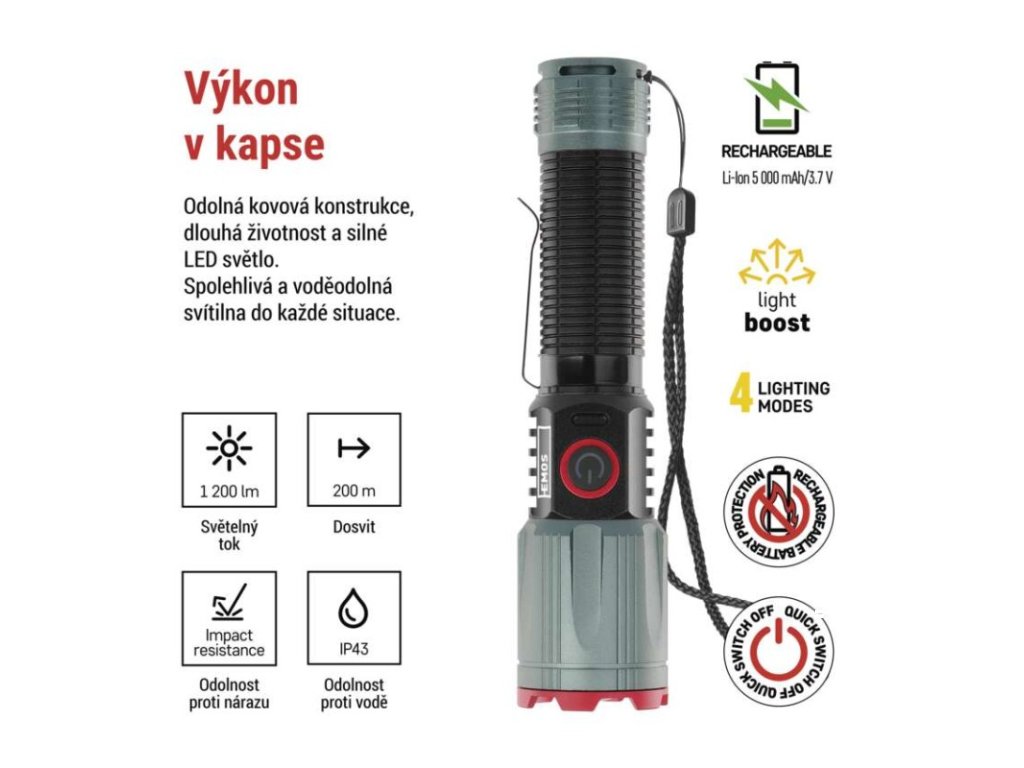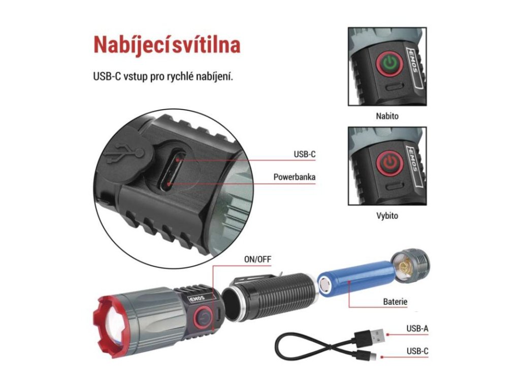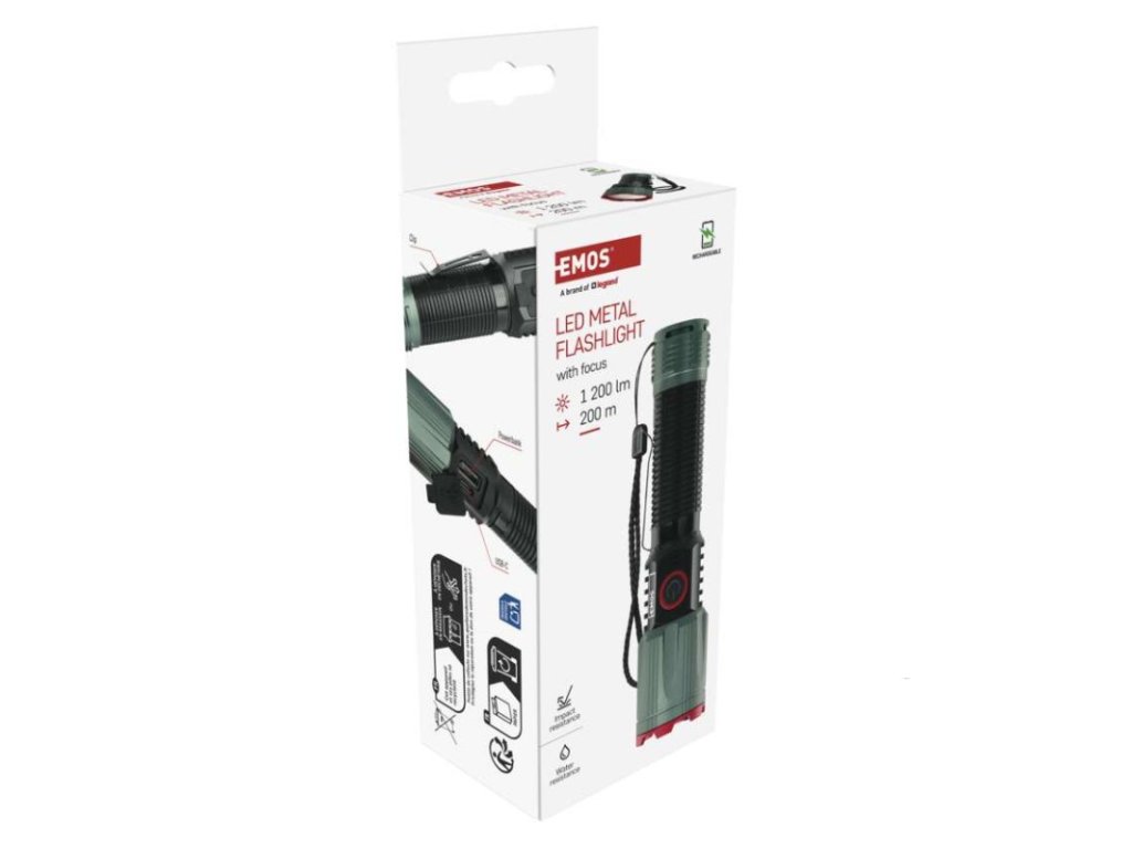 barva: černá, metalická šedá|baterie součástí balení: ano|doba nabíjení: 4,5 h|doba svícení: 4–22 h|doba svícení detail: LED BOOST – 1 min, LED 100 % – 4 h, LED 50 % – 8 h, LED 10 % – 22 h|dosvit: LED BOOST – 200 m, LED 100 % – 140 m, LED 50 % – 100 m, LED 10 % – 50 m|fokus: ano|hmotnost: 168 g|LED indikace nabíjení: ano|LED indikace stavu akumulátoru: ano|materiál: hliník|maximální dosvit: 200 m|maximální světelný tok: 1 200 lm|nabíjecí: ano|napájení: Li-Ion 18650|nárazuvzdornost: ano|počet režimů svícení: 4|příslušenství: neuvádí se|prodejní obal: 1 ks, krabice|režimy svícení: LED BOOST, LED 100 %, LED 50 %, LED 10 %|rozměr: 150 × 35 × 35 mm|speciální funkce: funkce rychlého vypnutí, funkce ochrany baterie, funkce powerbank|světelný tok: LED BOOST – 1 200 lm, LED 100 % – 550 lm, LED 50 % – 300 lm, LED 10 % – 60 lm|typ baterie: 2 200 mAh/3,7 V|typ napájecího konektoru: USB-C|voděodolnost: ano (IP43)|vybavení: klip, magnet, poutko|záruční doba: 2 roky|zdroj světla: LED|značka: EMOSDoplňkové parametry