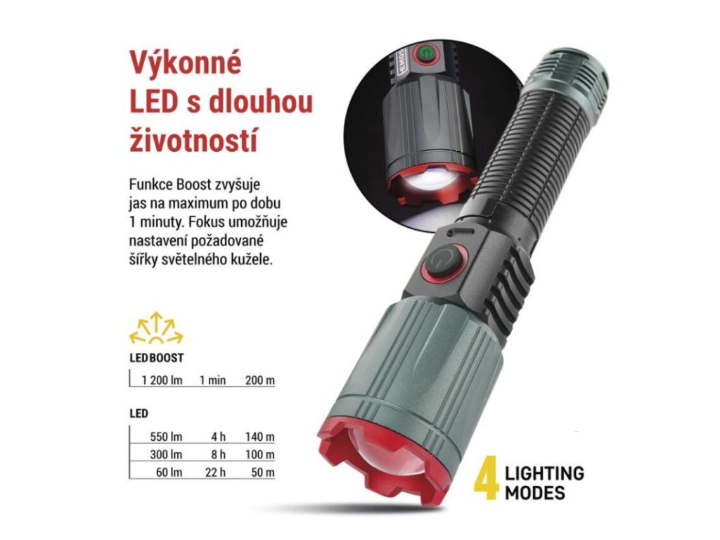 doba svícení detail: | LED BOOST – 1 min, LED 100 % – 4 h, LED 50 % – 8 h, LED 10 % – 22 h |