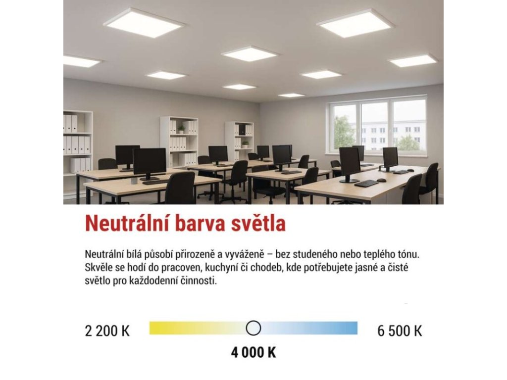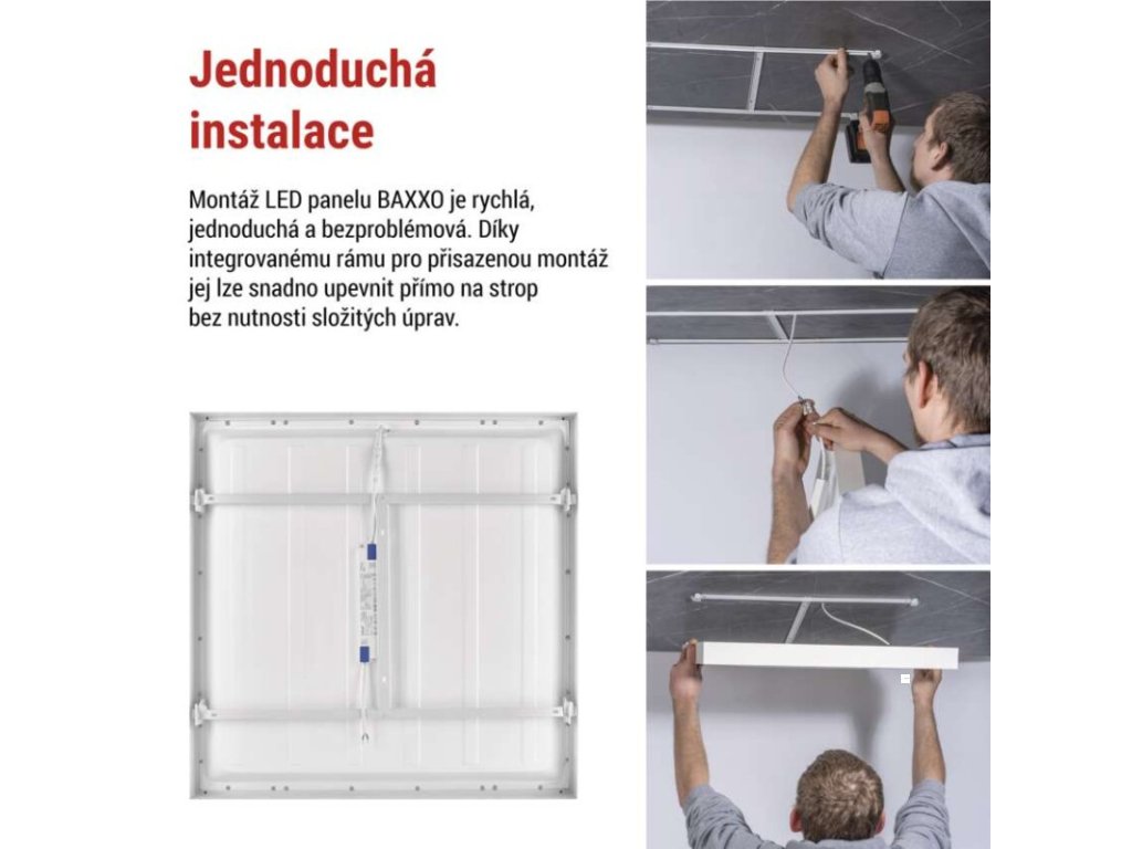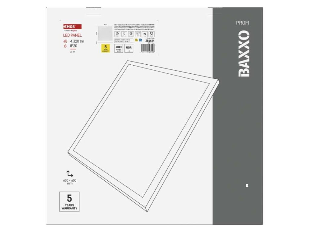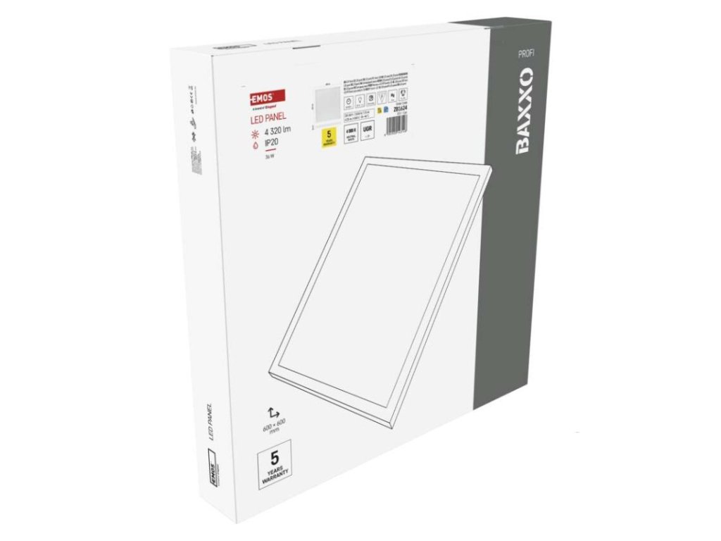barva světla: neutrální bílá|barva těla: bílá|dálkový ovladač: ne|další funkce: –|do chodby a na schodiště: ano|do dílny a garáže: ne|do kanceláře: ano|do koupelny: ne|do kuchyně: ano|do obýváku, ložnice a dětského pokoje: ano|dosah senzoru: nemá senzor|flicker-free: ano|frekvence: 50/60 Hz|index podání barev (CRI): Ra > 80|jazyky aplikace: –|kategorie: PROFI|kompatibilita: –|krytí: IP20|materiál difuzoru: plast (PS)|materiál LGP: neuvádí se|materiál těla: ocelový plech|montážní otvor: neuvádí se|možnost stmívání: ne|náhrada za žárovku: 4× 18 W CFL|napětí: 220–240 V~|na zahradu a balkon: ne|notifikace do mobilní aplikace: ne|obsah balení: –|ovládání hlasovými asistenty: ne|podporované OS: –|pohybový senzor: ne|přenosová frekvence: –|příkon: 36 W|prodejní obal: 1 ks, krabice|protokol: –|proud: 170 mA|řada: BAXXO|rozměr: 600 × 600 × 50 mm|světelná účinnost: 120 lm/W|světelný tok: 4 320 lm|teplota chromatičnosti: 4 000 K|tvar: čtverec|typ difuzoru: mléčný|typ svítidla: panel|účiník: > 0,9|UGR<: 22|úhel vyzařování: 120°|umístění: stropní/nástěnné|výstupní proud ze zdroje: 950 mA|záruční doba: 5 let|zdroj světla: LED|životnost: 50 000 hodin|způsob montáže: přisazenéDoplňkové parametry