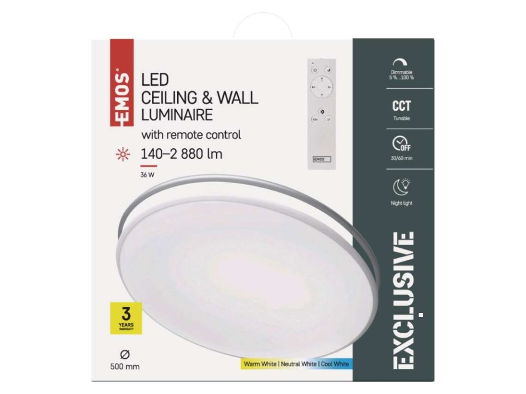 barva světla: teplá bílá–studená bílá|barva těla: bílá|dálkový ovladač: ano|do chodby a na schodiště: ne|do dílny a garáže: ne|do kanceláře: ano|do koupelny: ne|do kuchyně: ano|do obýváku, ložnice a dětského pokoje: ano|dosah senzoru: nemá senzor|flicker-free: ano|frekvence: 50/60 Hz|index podání barev (CRI): Ra > 80|kategorie: EXCLUSIVE|krytí: IP20|materiál difuzoru: plast (PMMA)|materiál LGP: neuvádí se|materiál těla: ocelový plech|montážní otvor: neuvádí se|možnost stmívání: ano|náhrada za žárovku: 170 W|napětí: 220–240 V|na zahradu a balkon: ne|pohybový senzor: ne|příkon: 36 W|prodejní obal: 1 ks, krabice|proud: 180 mA|řada: ALVI|rozměr: průměr 500 × 60 mm|světelná účinnost: 80 lm/W|světelný tok: 140–2 880 lm|teplota chromatičnosti: 2 700–6 500 K|tvar: kruh|typ difuzoru: mléčný|typ svítidla: klasické svítidlo|účiník: > 0,9|UGR<: neuvádí se|úhel vyzařování: 115°|umístění: stropní|výstupní proud ze zdroje: neuvádí se|záruční doba: 3 roky|zdroj světla: LED|životnost: 25 000 hodin|způsob montáže: přisazenéDoplňkové parametry