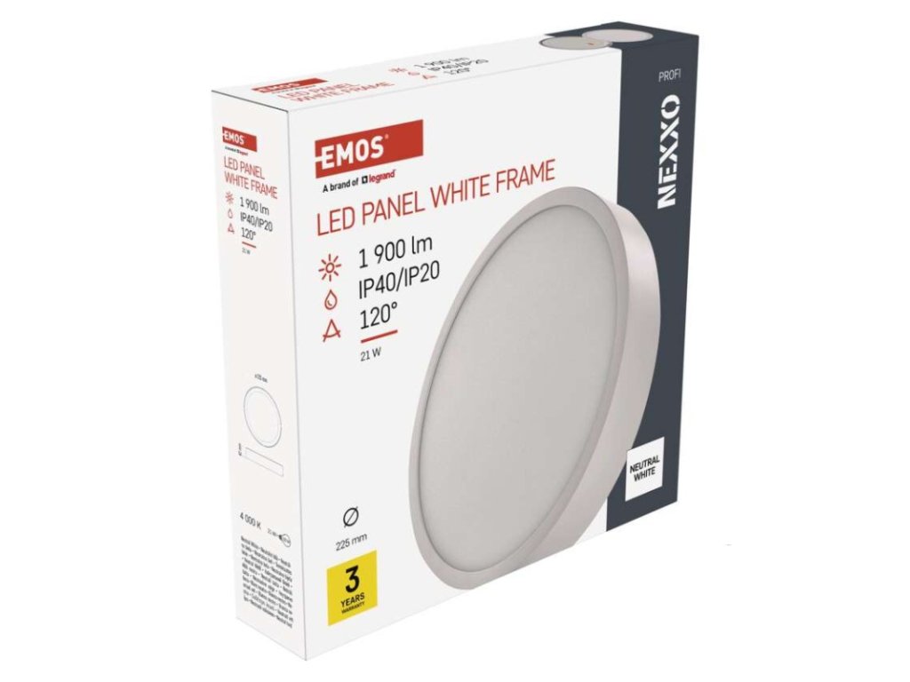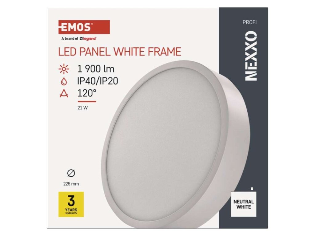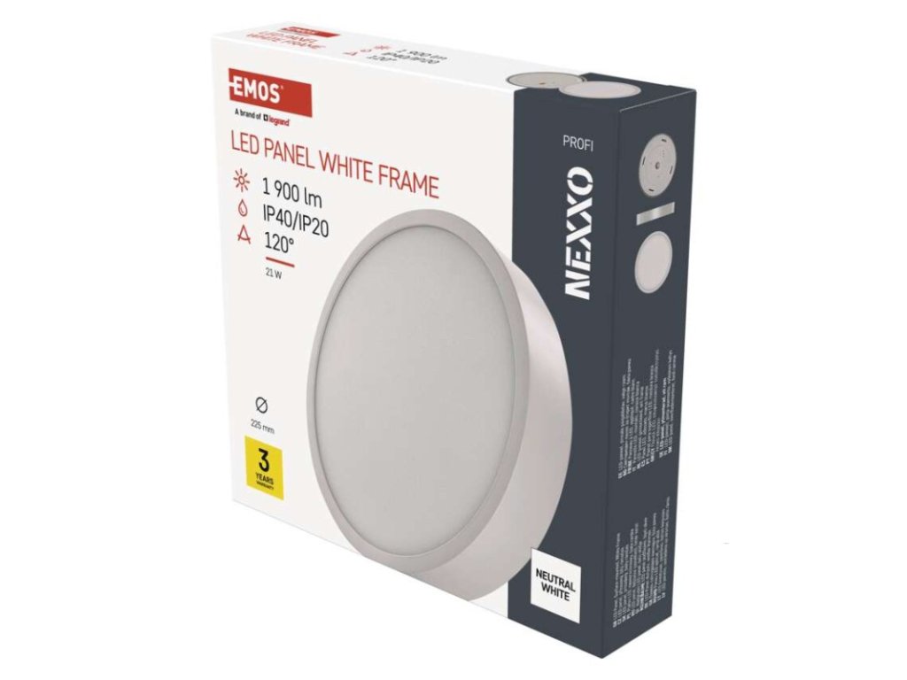 barva světla: neutrální bílá|barva těla: bílá|dálkový ovladač: ne|do chodby a na schodiště: ano|do dílny a garáže: ne|do kanceláře: ano|do koupelny: ne|do kuchyně: ano|do obýváku, ložnice a dětského pokoje: ano|dosah senzoru: nemá senzor|flicker-free: nebliká|frekvence: 50/60 Hz|index podání barev (CRI): Ra > 80|kategorie: PROFI|krytí: IP20/IP40|materiál difuzoru: plast (PMMA)|materiál LGP: PMMA|materiál těla: ocelový plech|montážní otvor: neuvádí se|možnost stmívání: ne|náhrada za žárovku: 120 W|napětí: 220–240 V|na zahradu a balkon: ne|pohybový senzor: ne|příkon: 21 W|prodejní obal: 1 ks, papírová krabička|proud: 700 mA|řada: NEXXO|rozměr: průměr 225 × 42 mm|světelná účinnost: 90 lm/W|světelný tok: 1 900 lm|teplota chromatičnosti: 4 000 K|tvar: kruh|typ difuzoru: mléčný|typ svítidla: klasické svítidlo|účiník: > 0,9|UGR<: neuvádí se|úhel vyzařování: 120°|umístění: stropní/nástěnné|výstupní proud ze zdroje: neuvádí se|záruční doba: 3 roky|zdroj světla: LED|životnost: 30 000 hodin|způsob montáže: přisazenéDoplňkové parametry