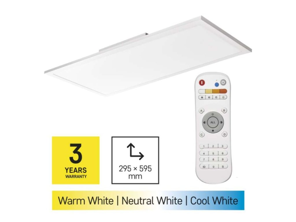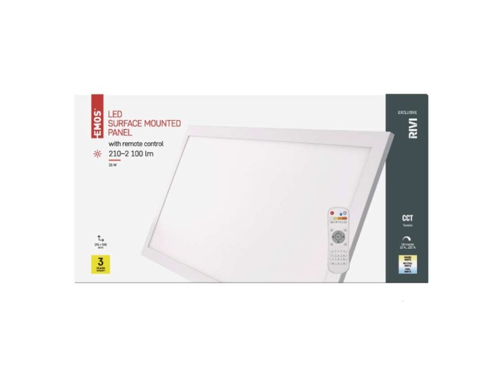 barva světla: teplá bílá–studená bílá|barva těla: bílá|dálkový ovladač: ano|do chodby a na schodiště: ne|do dílny a garáže: ne|do kanceláře: ano|do koupelny: ne|do kuchyně: ano|do obýváku, ložnice a dětského pokoje: ano|dosah senzoru: nemá senzor|flicker-free: ano|frekvence: 50/60 Hz|index podání barev (CRI): Ra > 80|kategorie: EXCLUSIVE|krytí: IP20|materiál difuzoru: plast (PC)|materiál LGP: PS|materiál těla: hliník|montážní otvor: neuvádí se|možnost stmívání: ano|náhrada za žárovku: neuvádí se|napětí: 220–240 V|na zahradu a balkon: ne|pohybový senzor: ne|příkon: 25 W|prodejní obal: 1 ks, krabice|proud: 110 mA|řada: RIVI|rozměr: 295 × 595 × 52 mm|světelná účinnost: 85 lm/W|světelný tok: 210–2 100 lm|teplota chromatičnosti: 2 700–6 000 K|tvar: obdelník|typ difuzoru: mléčný|typ svítidla: klasické svítidlo|účiník: > 0,9|UGR<: 22|úhel vyzařování: 115°|umístění: stropní|výstupní proud ze zdroje: neuvádí se|záruční doba: 3 roky|zdroj světla: LED|životnost: 30 000 hodin|způsob montáže: přisazenéDoplňkové parametry