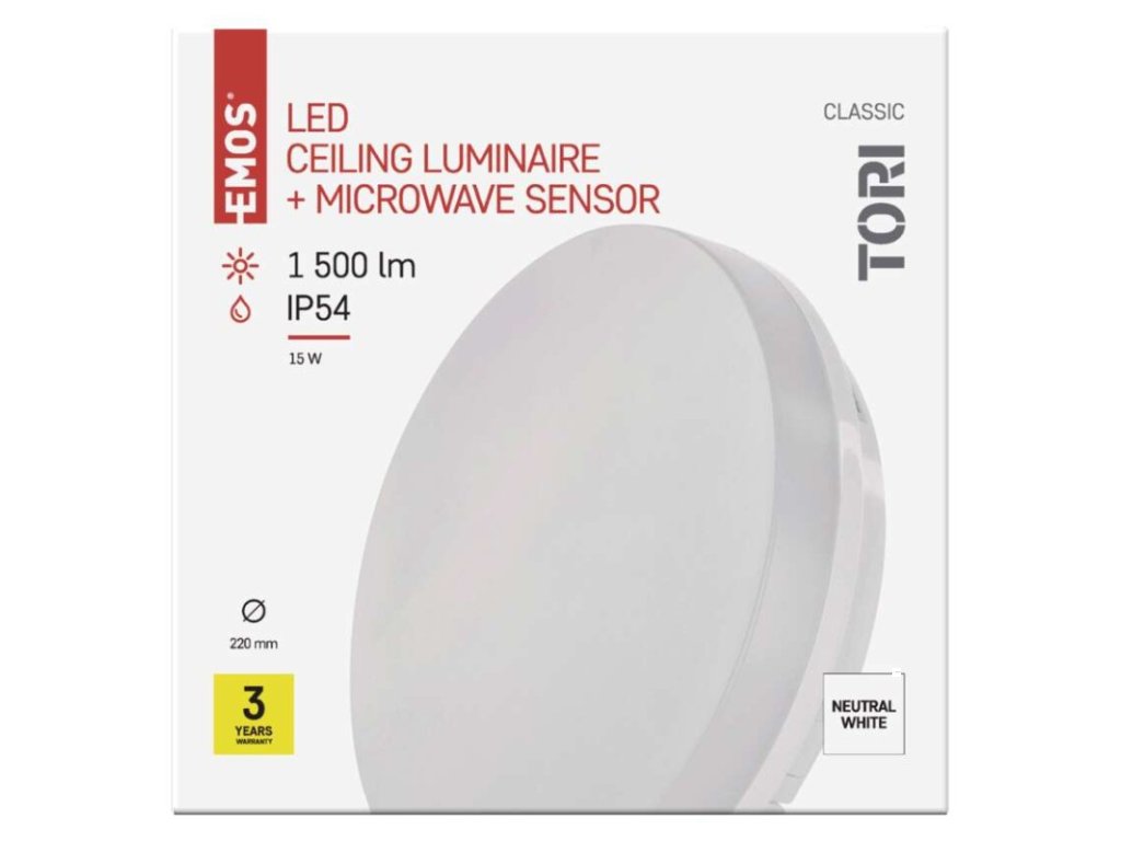 barva světla: neutrální bílá|barva těla: bílá|dálkový ovladač: ne|do chodby a na schodiště: ano|do dílny a garáže: ano|do kanceláře: ne|do koupelny: ano|do kuchyně: ano|do obýváku, ložnice a dětského pokoje: ne|dosah senzoru: 10 m|flicker-free: ano|frekvence: 50/60 Hz|index podání barev (CRI): Ra > 80|kategorie: CLASSIC|krytí: IP54|materiál difuzoru: plast (PC)|materiál LGP: neuvádí se|materiál těla: plast (PC)|montážní otvor: neuvádí se|možnost stmívání: ne|náhrada za žárovku: 100 W|napětí: 220–240 V|na zahradu a balkon: ano|pohybový senzor: MW|příkon: 15 W|prodejní obal: 1 ks, krabice|proud: 73 mA|řada: TORI|rozměr: 220 × 53 mm|světelná účinnost: 100 lm/W|světelný tok: 1 500 lm|teplota chromatičnosti: 4 000 K|tvar: kruh|typ difuzoru: mléčný|typ svítidla: klasické svítidlo|účiník: > 0,9|UGR<: neuvádí se|úhel vyzařování: 120°|umístění: stropní/nástěnné|výstupní proud ze zdroje: 200 mA|záruční doba: 3 roky|zdroj světla: LED|životnost: 30 000 hodin|způsob montáže: přisazenéDoplňkové parametry